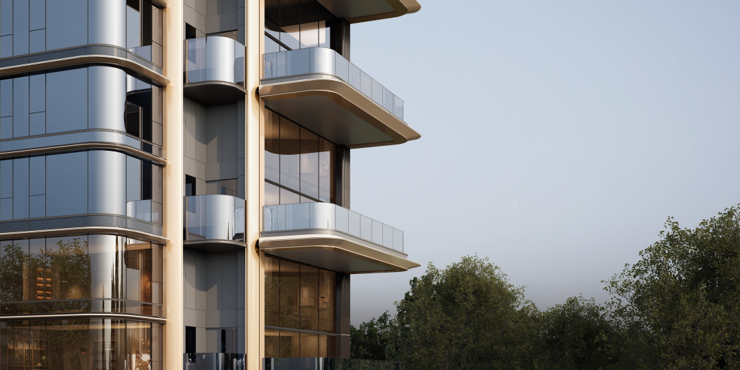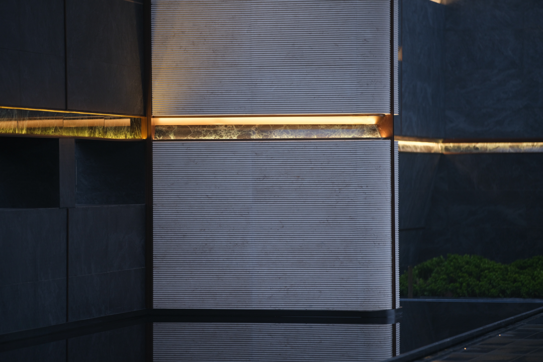 在两侧的造型柱上,部分嵌入了百达翡绿石材作为点缀,以丰富立面色彩。造型处理上,局部采用了弧形倒角石材,其分缝位置自圆弧切点起向直线段延伸5至10公分,以此确保整体石材安装交接顺滑,提升完成面的平整度,精准把控落地品质。