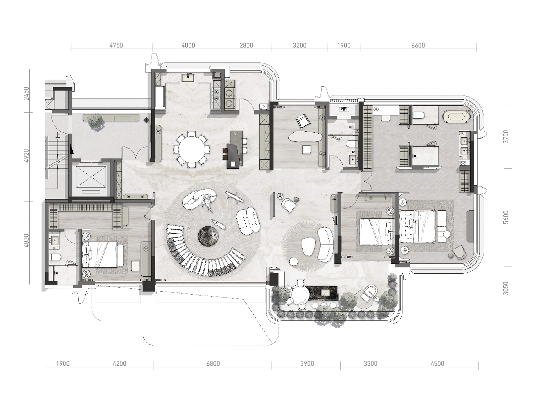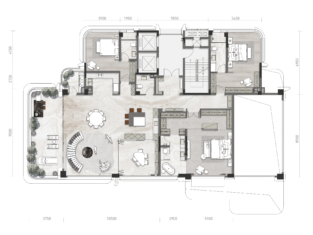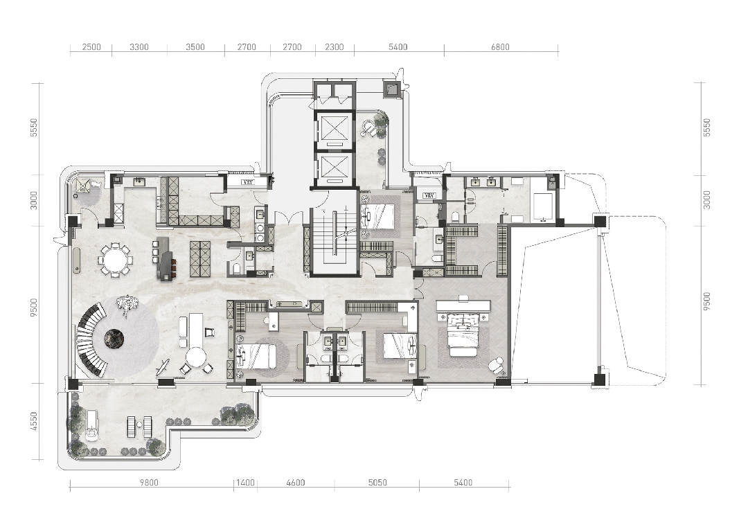户型面积段覆盖205/260/310㎡,四栋T1产品(260/310㎡)均为一层一户、一户双梯设计。T1相邻层互跃挑空,客厅区域我们取消了传统通高客厅的土建横梁,实现了市场上中高层住宅极为罕见的客厅通高无横向拉梁的设计,客厅与花园区域双层通高约6.4m,两层通高的大玻璃面让外立面足够干净,也提供了极佳室内视觉效果,客厅与花园、室内与室外更接近“与自然共生”,取得了四代宅套内空间的突破性创新。将自然纳入到生活之中成为了我们的一种生活态度。