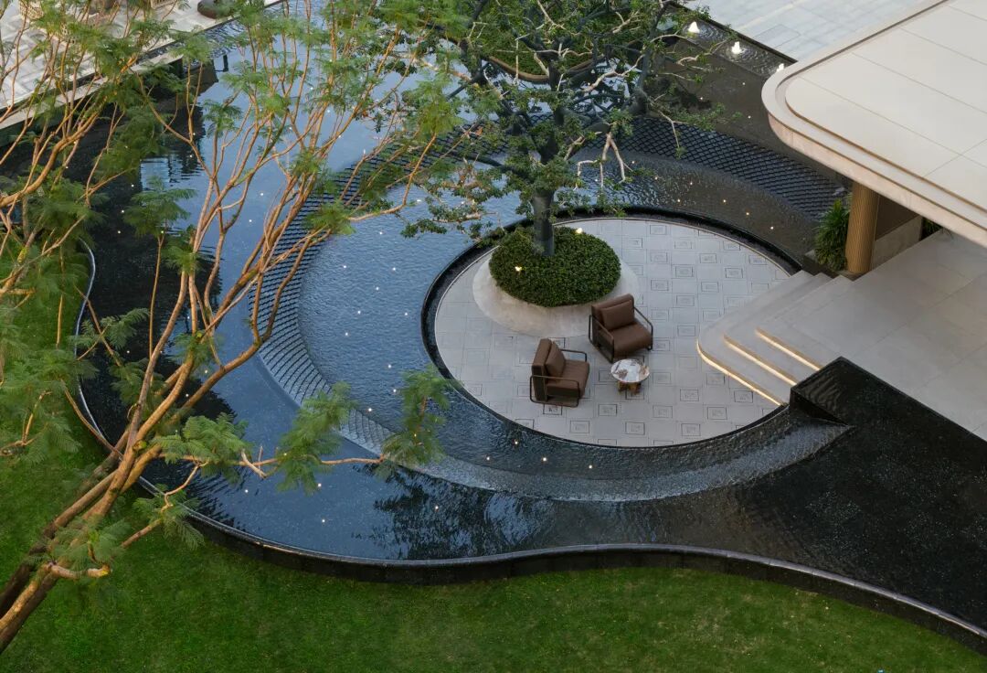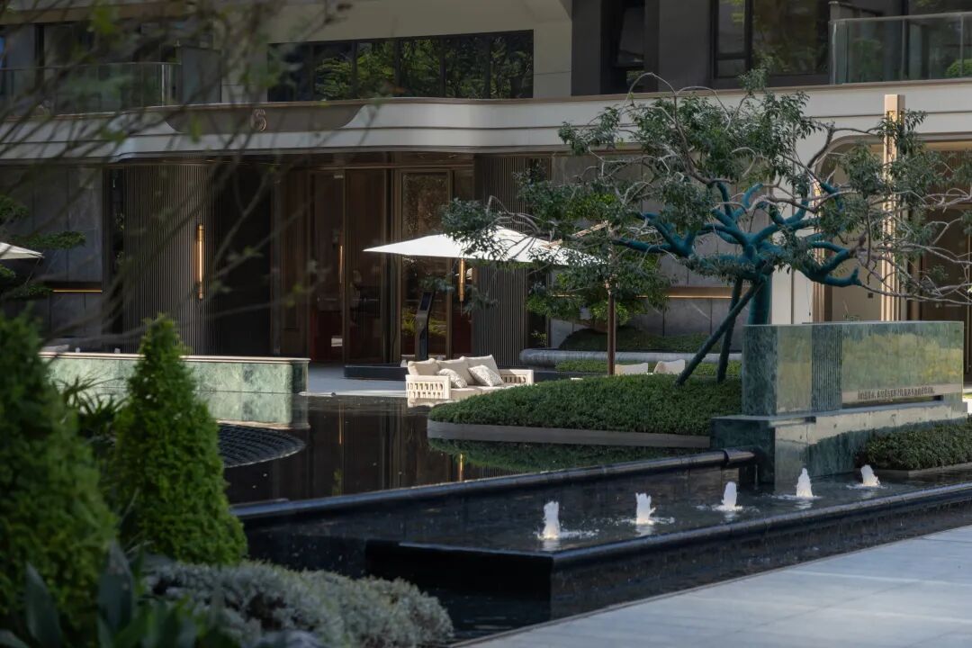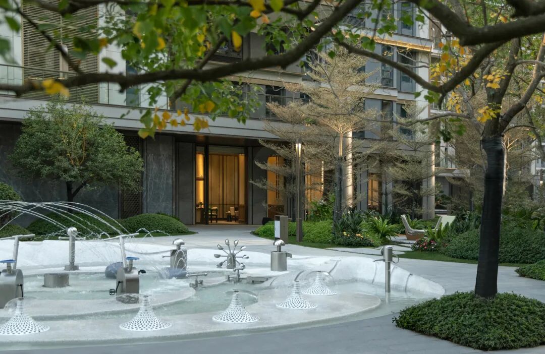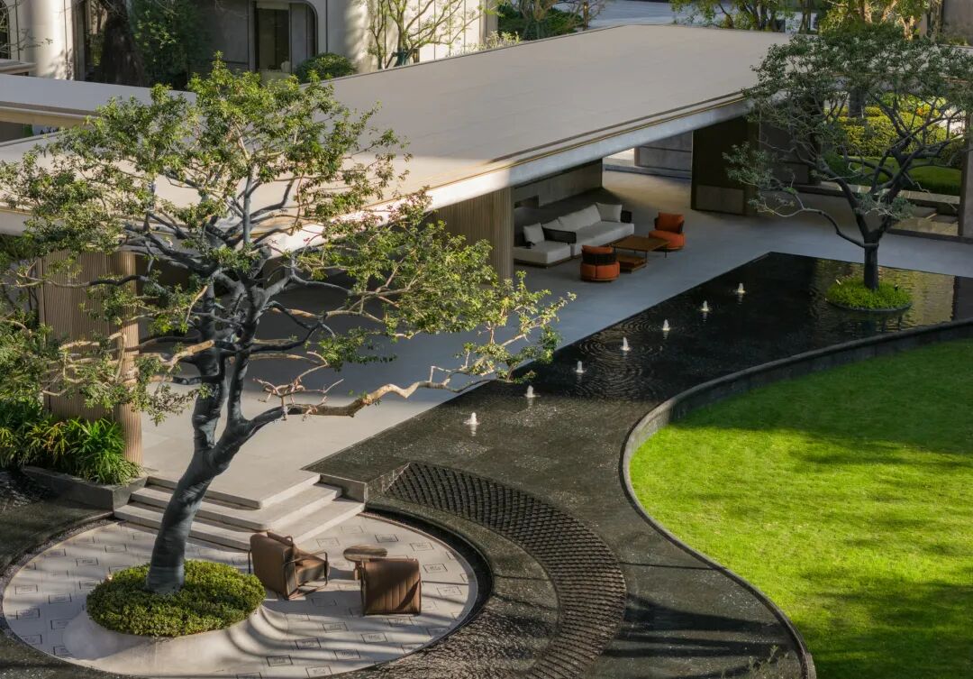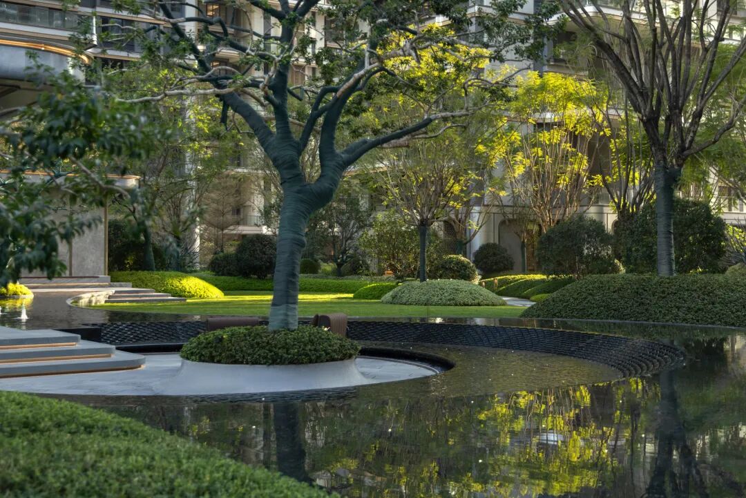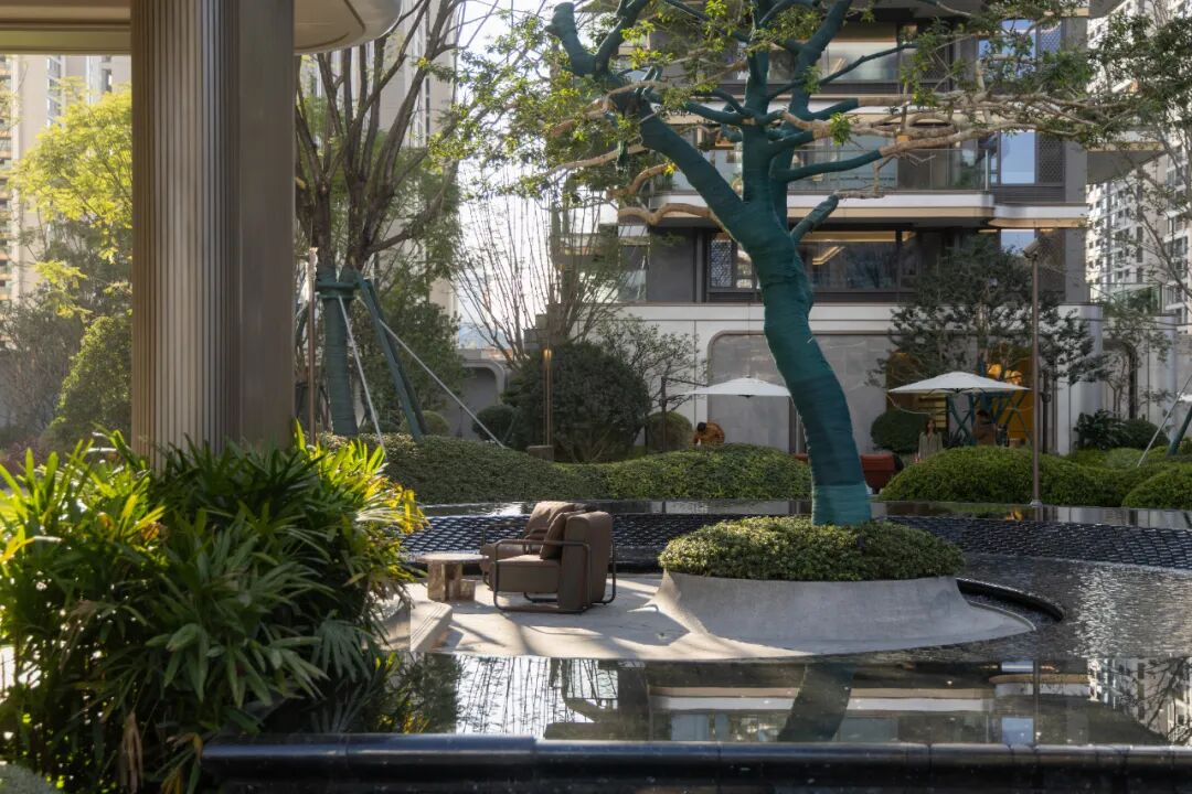 奢享玲珑水院华庭,在下沉庭院中感受空间的无限延伸,天然奢石打造的精奢品质景墙,体验臻品工艺的高定生活,通过镜面跌水的链接引入实现空间层次的碰撞,同时更加生动的展示出水空间动静结合的与其丰富性,特选的水院乌桕更是在水面的掩映下光华流转倾听着自然的奥妙。林影葱葱洒落于水雾氤氲的空间里,起承转合光影流转间的艺术表达。
