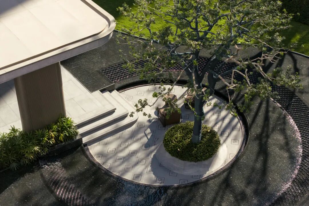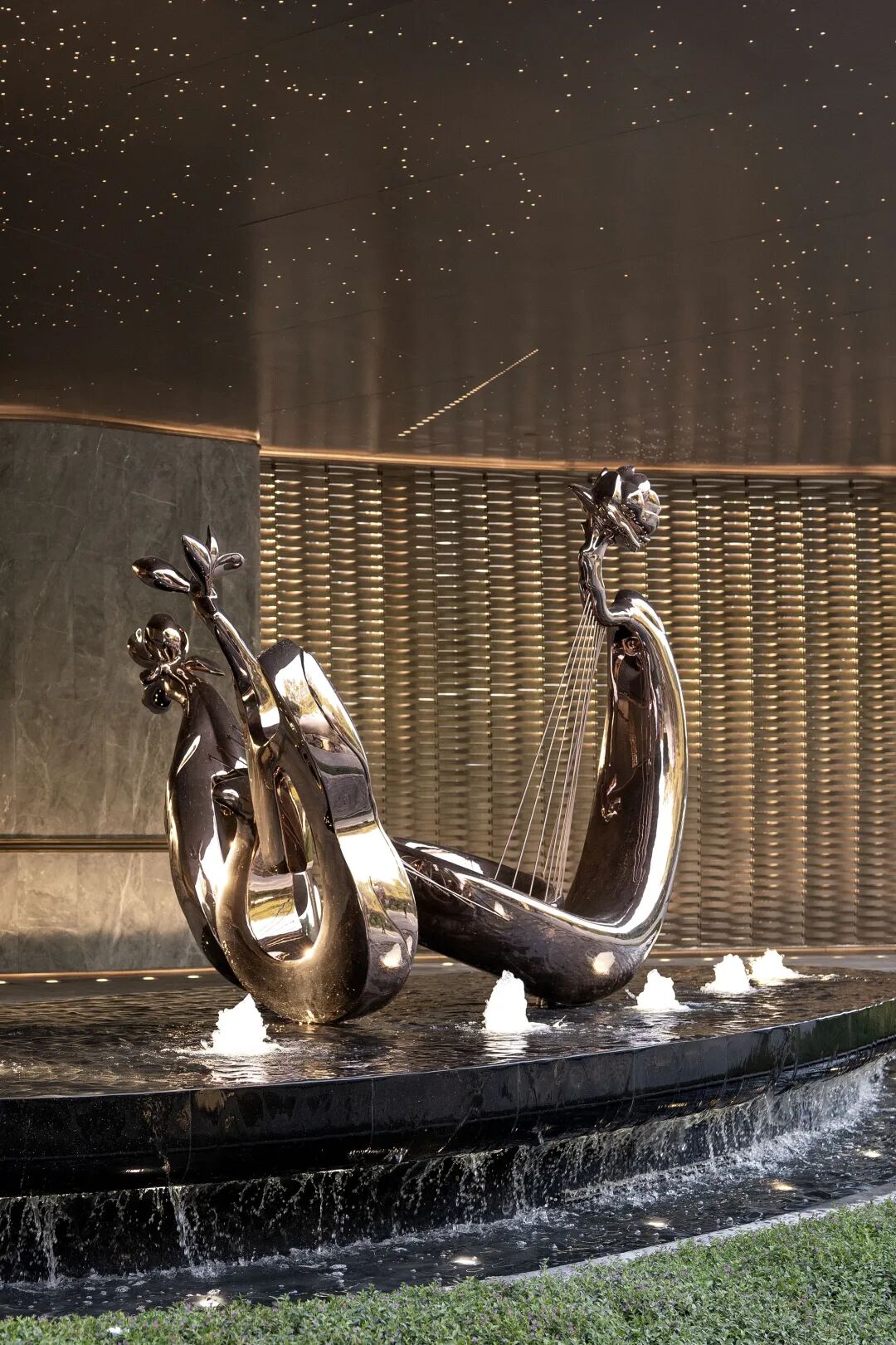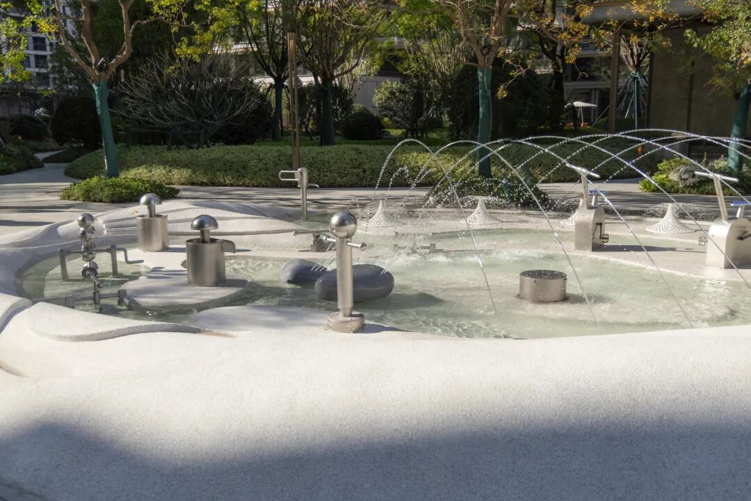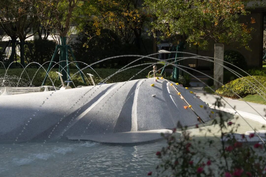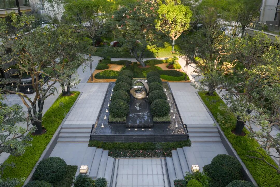 西侧次入口对景设计,水景以简洁的几何线条勾勒轮廓,哑光黑的石材池底与涌泉相映成趣,池心的金属艺术雕塑以圆润的弧线呼应水的柔态,又以利落的切面彰显现代美学,成为整个空间的视觉锚点。对称排布的球形灌木在步道两侧列队相迎,强化了仪式感。