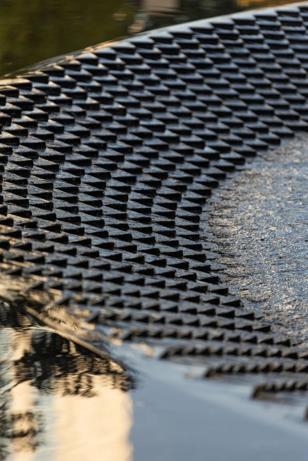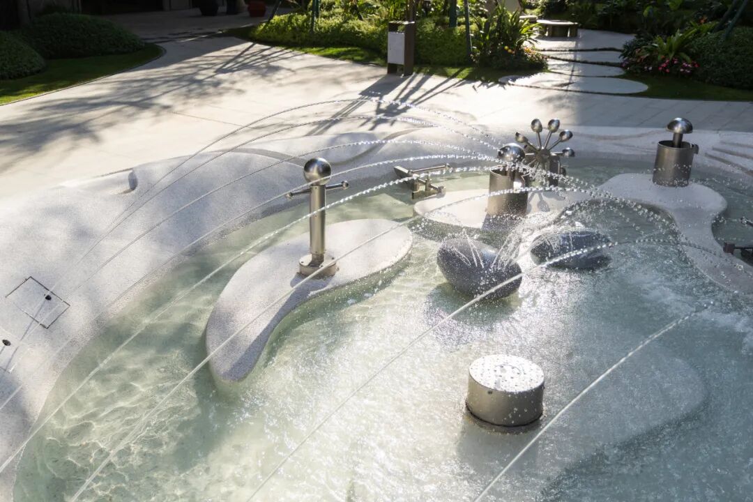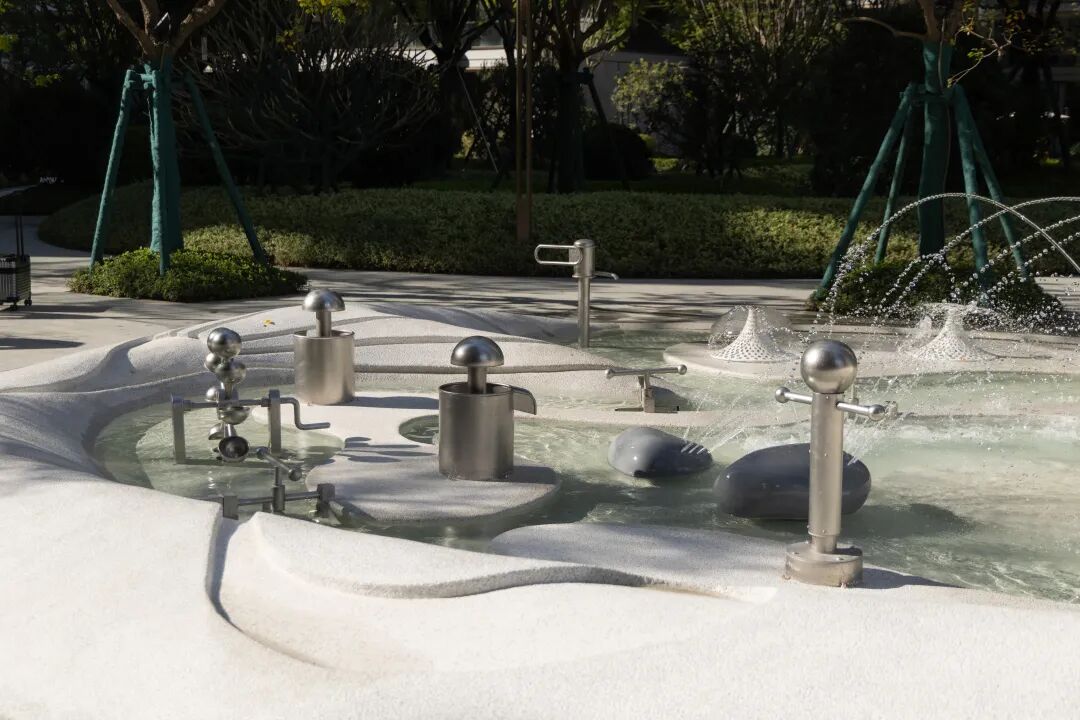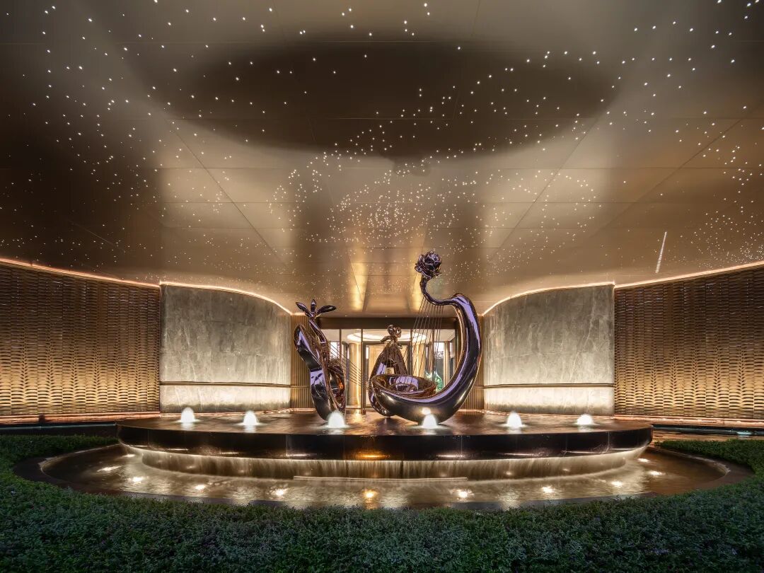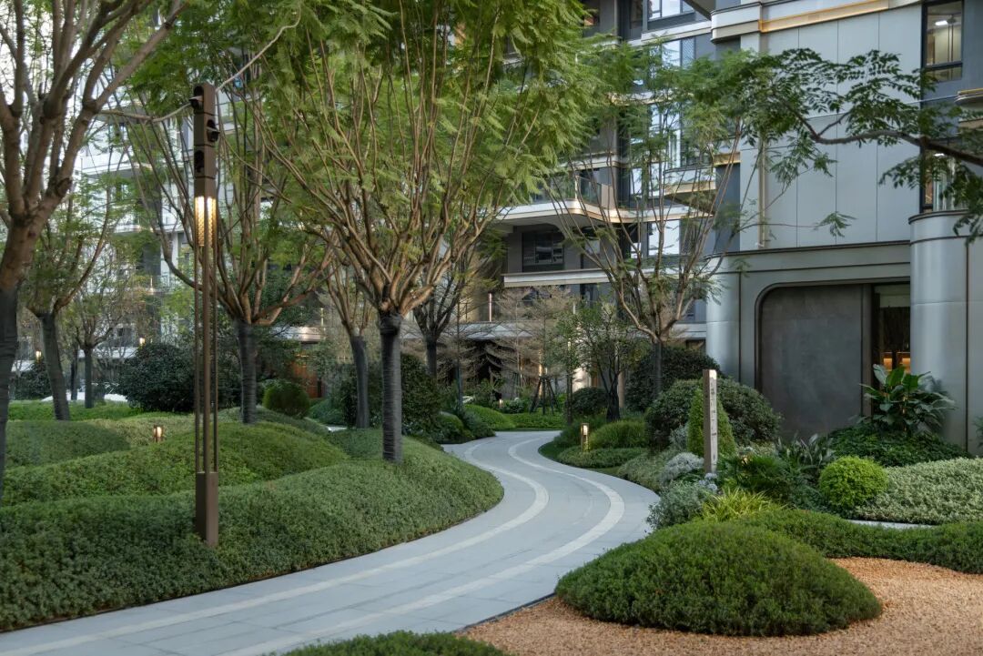 西侧次入口对景设计,水景以简洁的几何线条勾勒轮廓,哑光黑的石材池底与涌泉相映成趣,池心的金属艺术雕塑以圆润的弧线呼应水的柔态,又以利落的切面彰显现代美学,成为整个空间的视觉锚点。对称排布的球形灌木在步道两侧列队相迎,强化了仪式感。