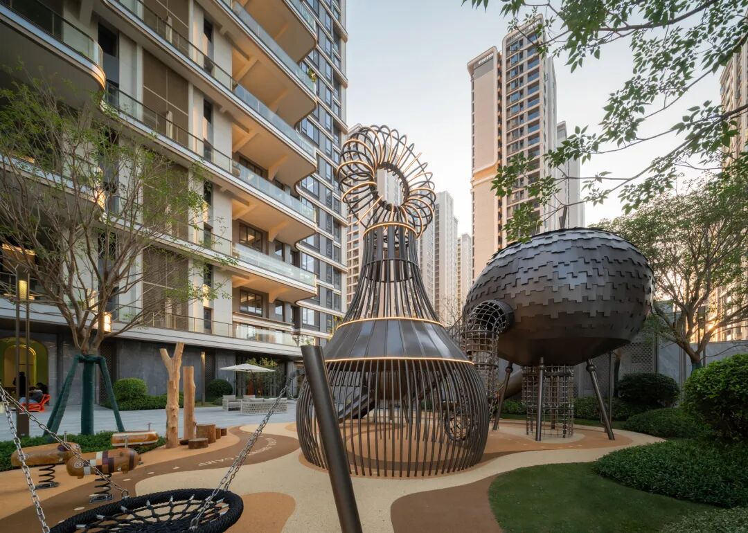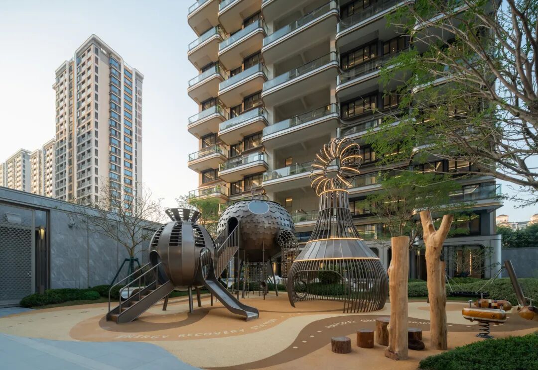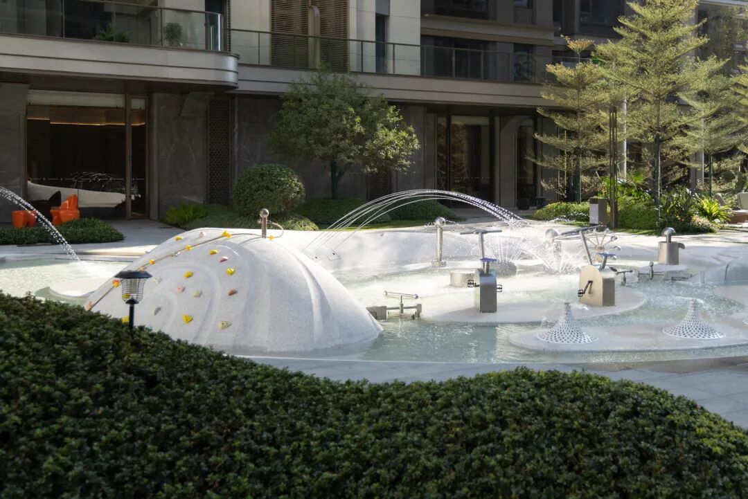 中央水景与宝格丽绿奢石景墙的融合,浑然天成,呈现出极致的奢华与自然气息。会客厅联动着儿童海岛花园,在孩童畅玩时,贴心提供了家长看护休息的空间。