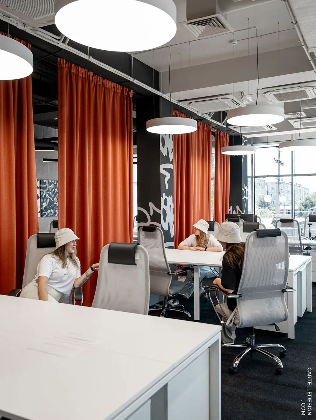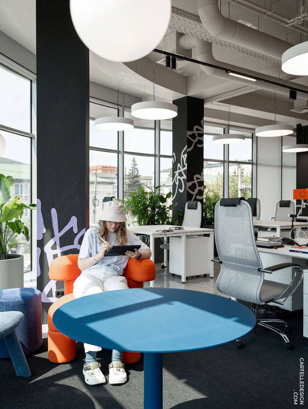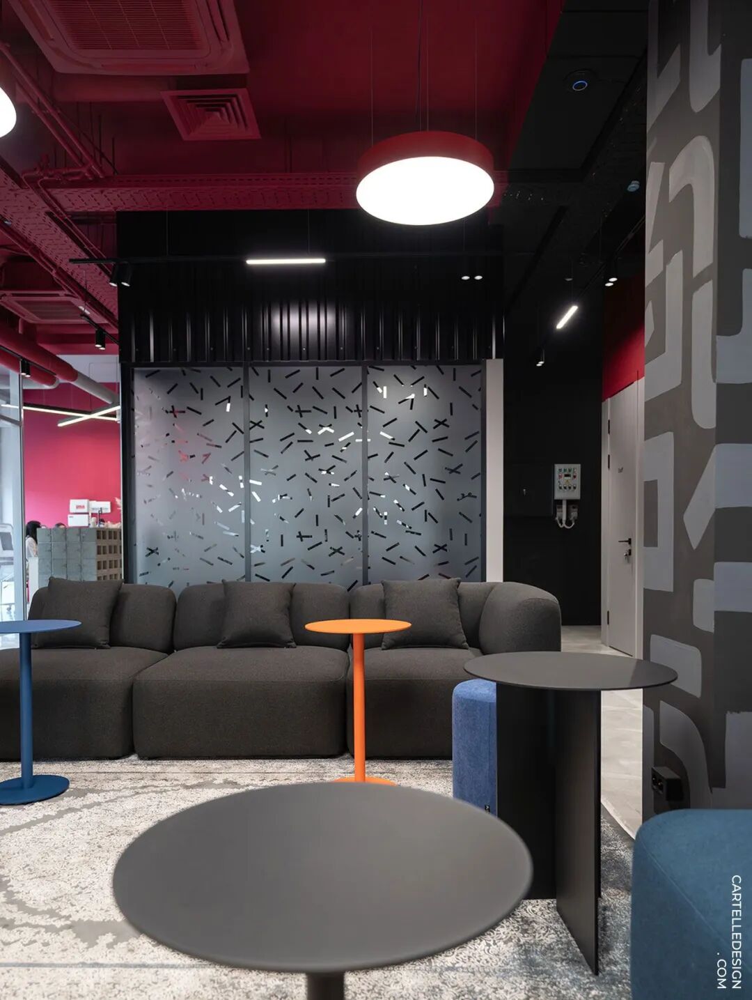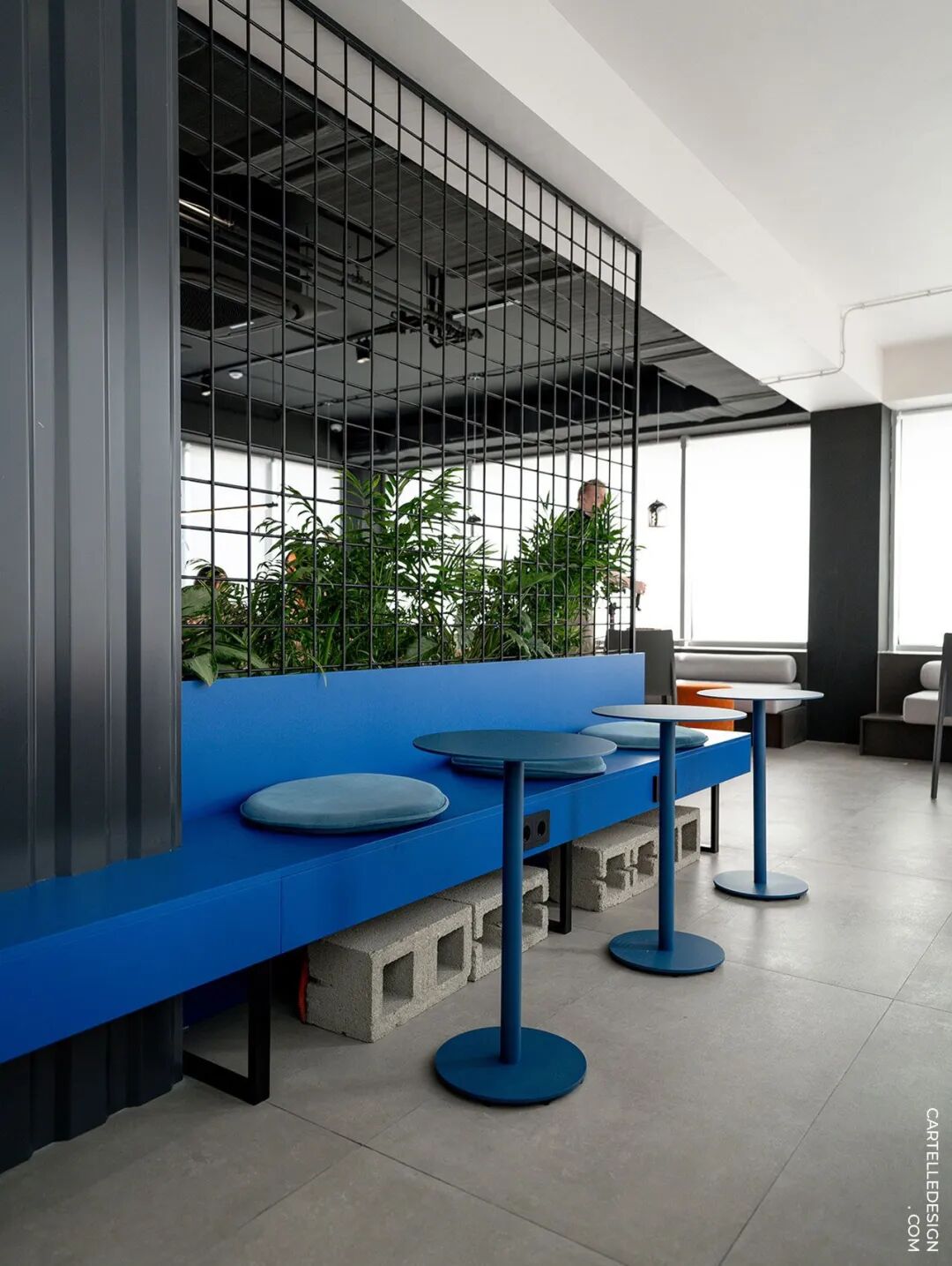 空间保留了首店原始质感的水泥肌理、简洁明快的几何构成,以及沉稳中跳脱出亮色的色彩逻辑。然而,这一次,设计师大胆采用了更浓郁、更具张力的色彩组合——优雅的橙红与深邃的海蓝贯穿空间,与黑白抽象图形相互碰撞,在工业风的冷峻基调上,叠加出一层时尚而艺术化的视觉层次,使整个环境既延续了品牌的冷静气质,又散发出轻松愉悦、激发灵感的工作氛围。