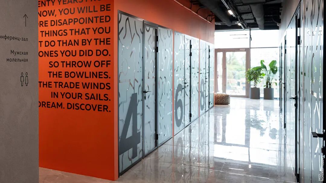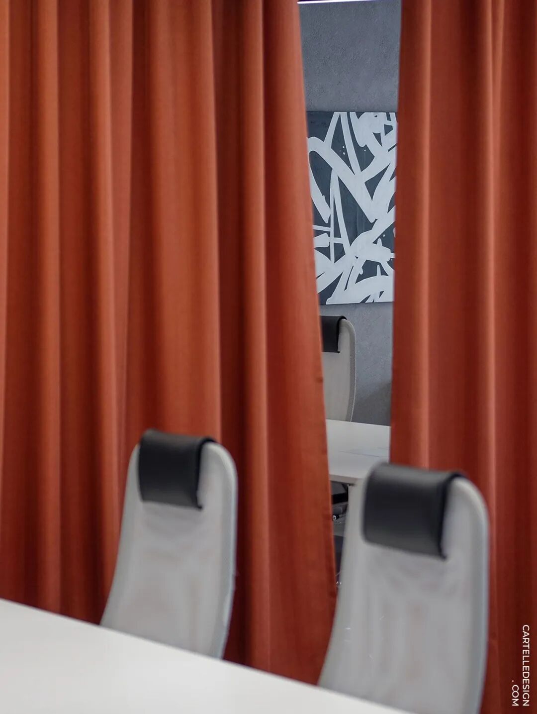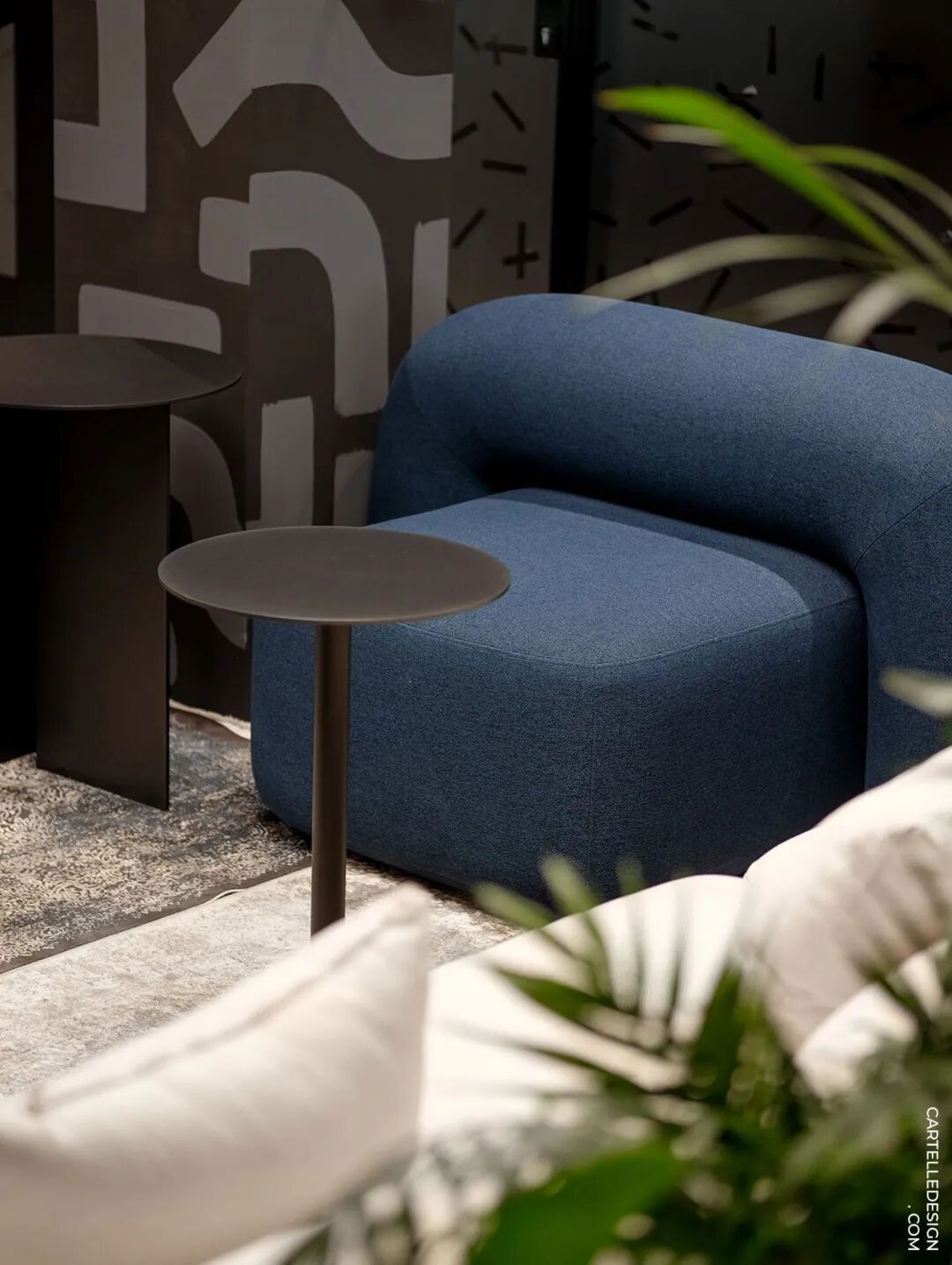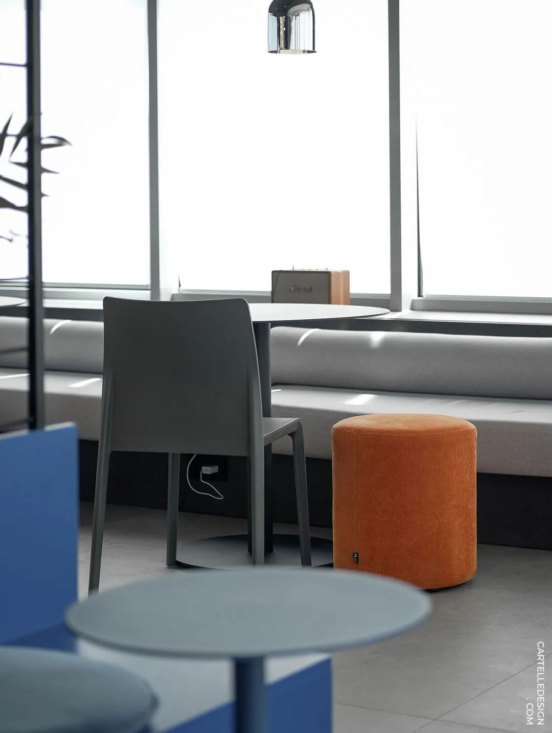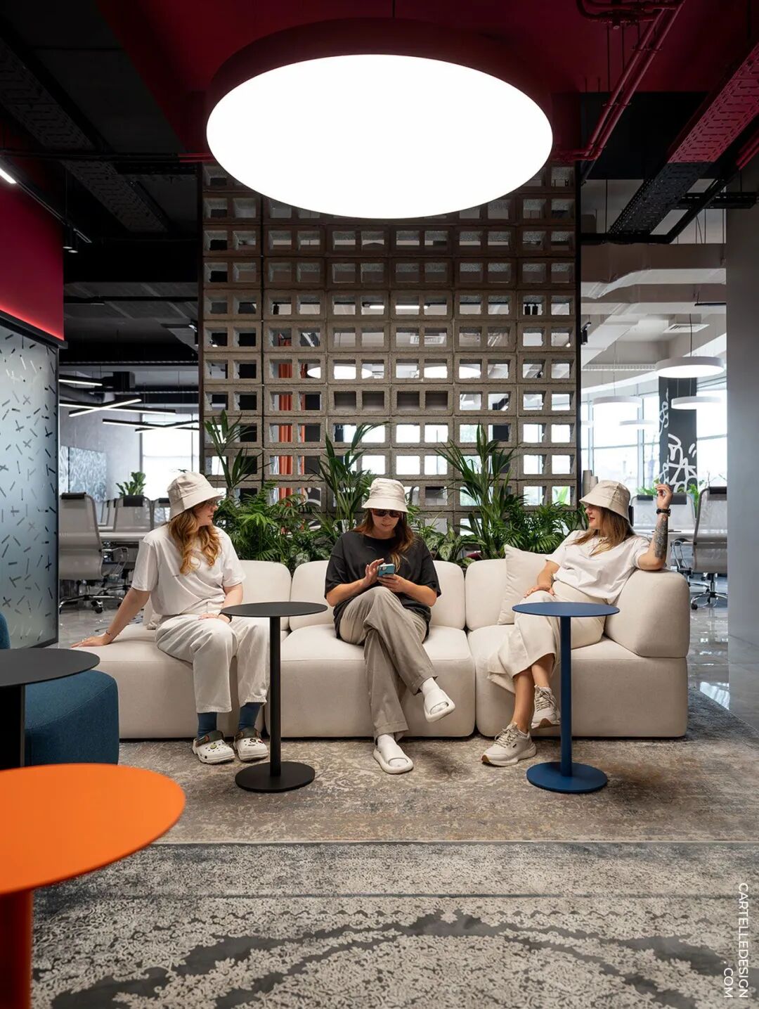 空间保留了首店原始质感的水泥肌理、简洁明快的几何构成,以及沉稳中跳脱出亮色的色彩逻辑。然而,这一次,设计师大胆采用了更浓郁、更具张力的色彩组合——优雅的橙红与深邃的海蓝贯穿空间,与黑白抽象图形相互碰撞,在工业风的冷峻基调上,叠加出一层时尚而艺术化的视觉层次,使整个环境既延续了品牌的冷静气质,又散发出轻松愉悦、激发灵感的工作氛围。