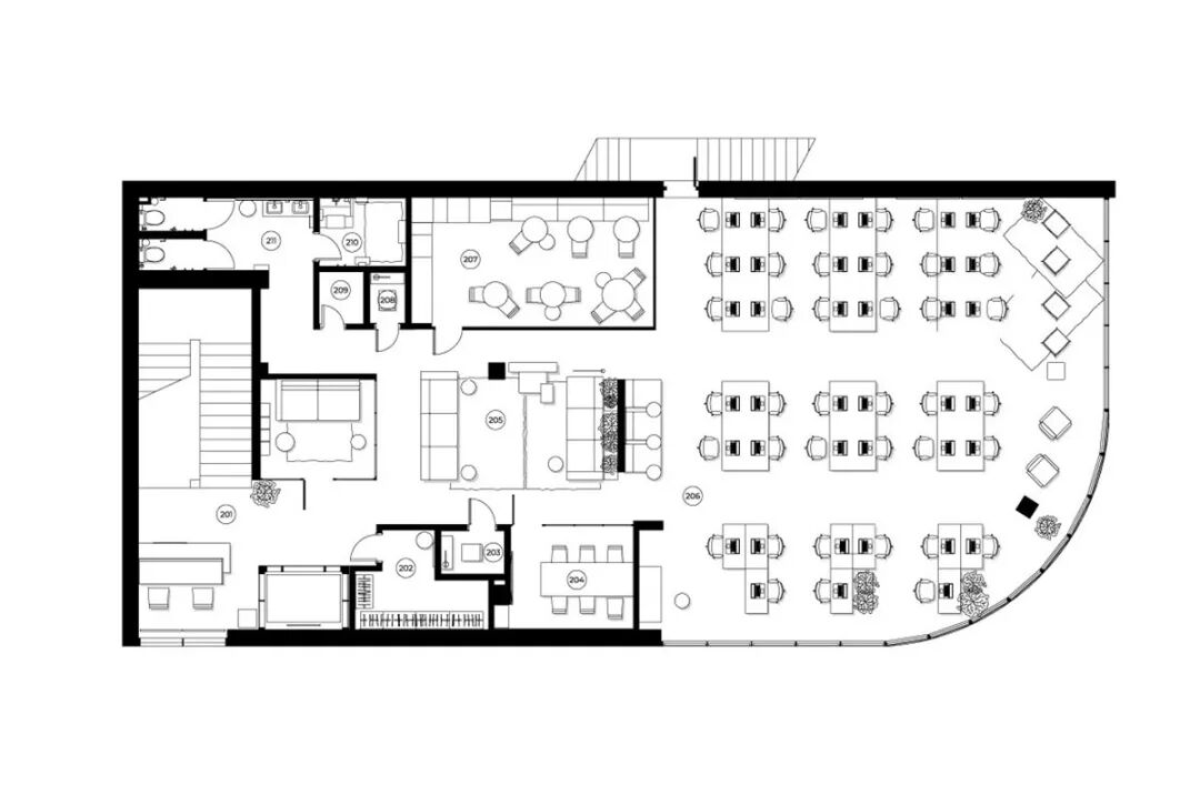 场所位于一栋四层建筑的二至四层。建筑的最大亮点是连续的带状全景采光窗,将自然光充分引入室内。二层光线最佳的区域被规划为开阔的开放式工作区,沿窗布置的工位最大化享受日光与视野;周围则点缀着多个独立办公室与会议室,兼顾隐私与协作需求。