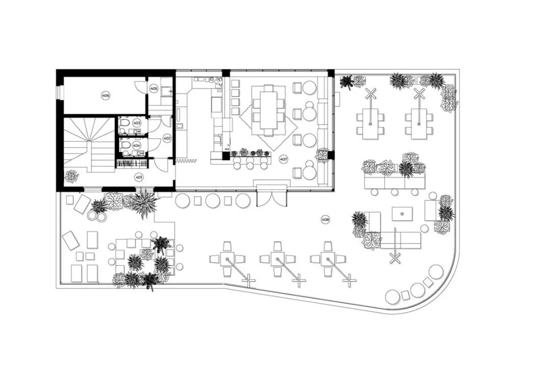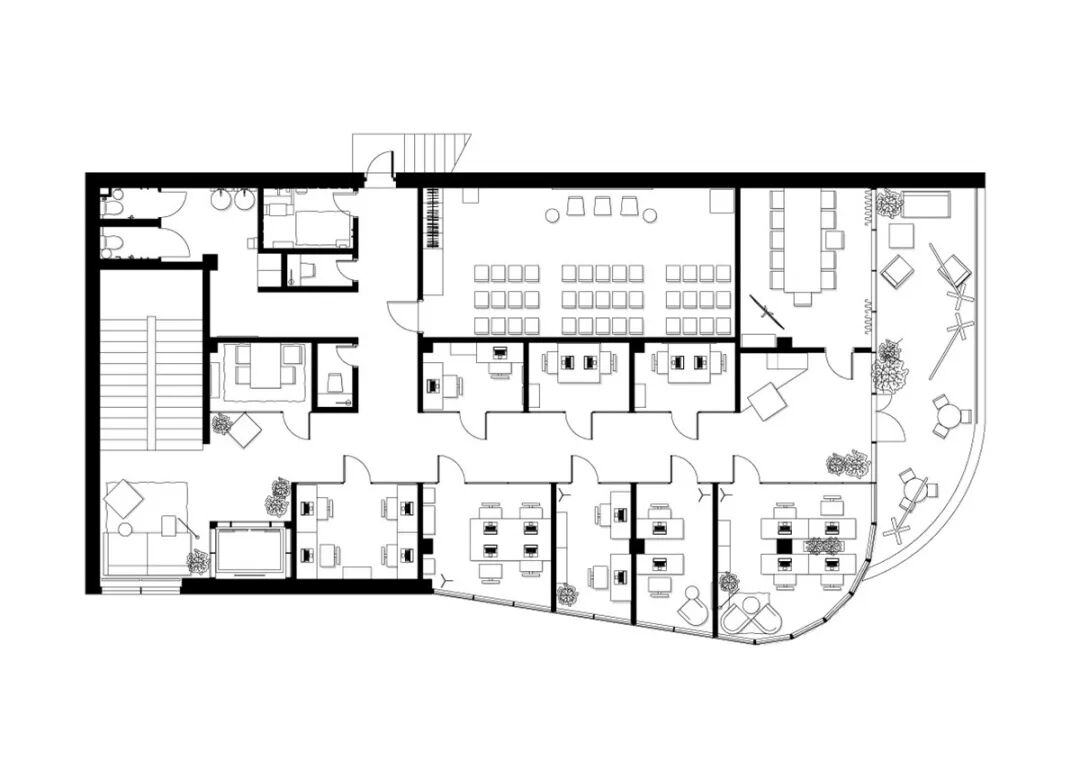 三层以2–4人规模的小型办公室为主,配有一间可满足团队会议或沙龙活动的会议室。四层则是休闲与社交枢纽,设有一处咖啡馆和连通室外的露台,既适合专注工作,也可用于放松交流,实现工作与生活的柔性过渡。