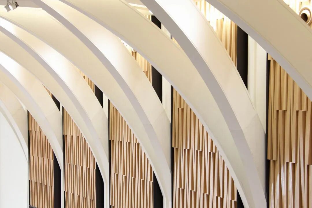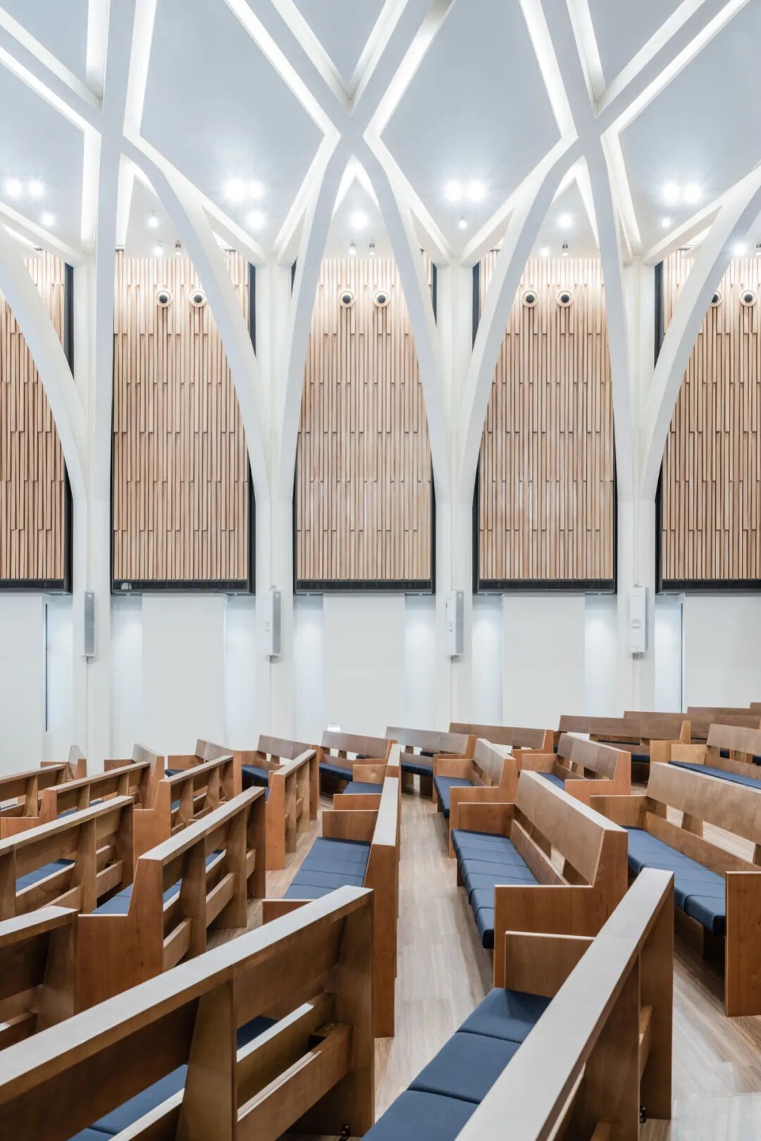 结构骨架的线性力量以一种前所未有的透明与轻盈,重塑了当代的礼拜空间。纵向侧壁是以云杉木条镶嵌而成的扩散墙面,既是对声学物理性能的精确回应,又以材料的温暖质感在技术理性与人文感知之间建立起微妙的张力,兼具空调系统的功能。