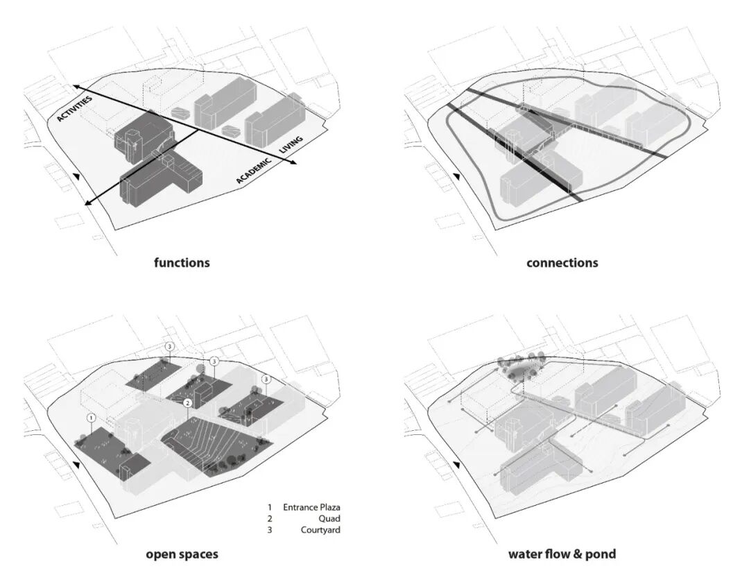 半开放的风雨走廊如纽带,串联起轴线上的各栋建筑,并与环场步道及院内绿地系统交织,将舒缓的草坡与渗透性绿地作为柔性的生态缓冲带与视觉联结,从而完成一个既尊重自然脉络、又满足现代教育复合需求的研究及生活群落。