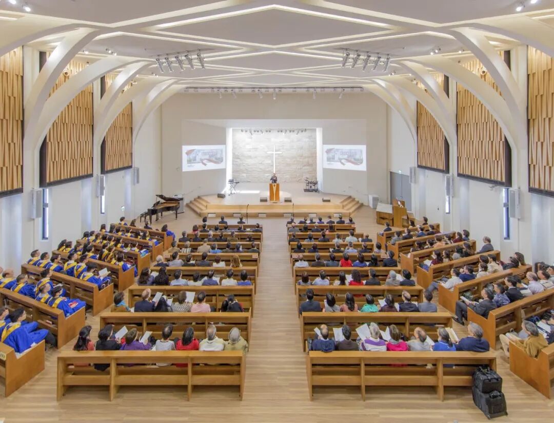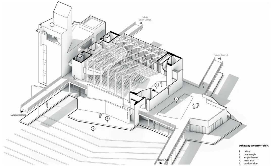 位于校园入口广场旁的礼堂大楼,是整体序列在空间与精神维度之中的锚点,其中的教堂是整个校园的凝聚之所,也是最具代表性的建筑物。建筑外观蕴含宗教意象的静默力量——教堂之上,十字架钟塔凌空而立,日光与月色在塔身周围缓缓流转,如无形的时光显影,在坚实的建筑材料上,留下关于晨昏与季节的、静谧而恒久的低语,与生态地景遥相呼应。