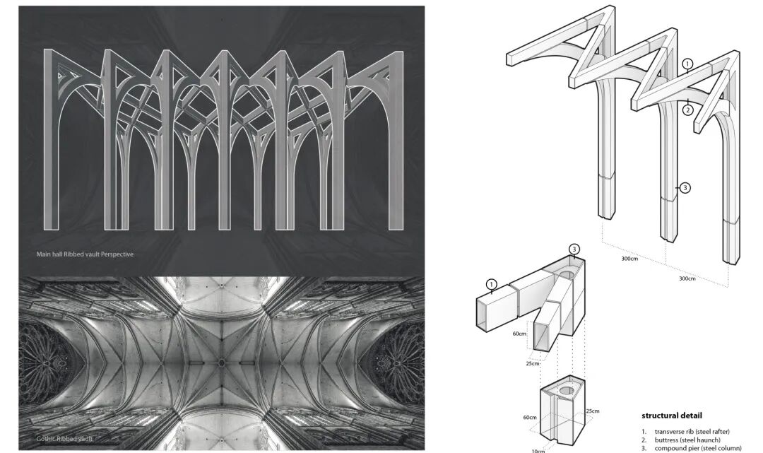 在大堂的空间建构中,24m×20m的无柱钢构空间,以其清晰的结构逻辑呈现出现代工程的理性力量。两侧钢柱向上延伸出斜向交错的网状梁系统,构建出大跨度的拱形天幕。这一现代建构语言,并非简单模仿,而是对哥特建筑精髓——肋状拱顶的深刻解构与转译。