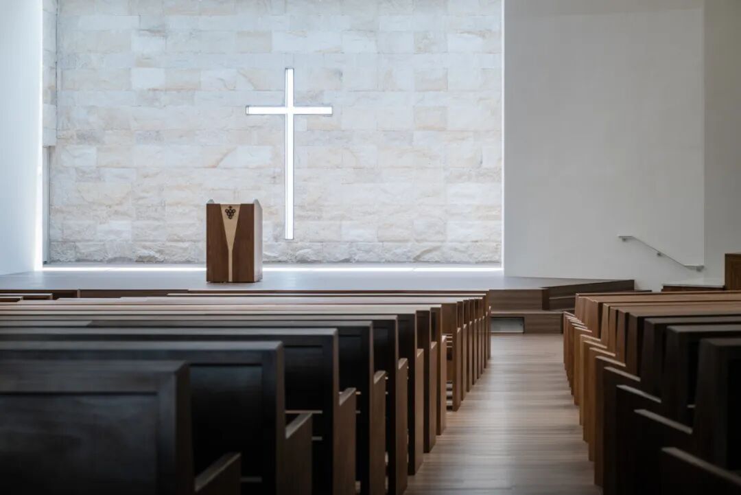 与大堂空间相比,讲台相对简朴,呈现出一种洗练的专注。主墙以暖色调的天然岗石覆盖,质地坚实而温厚。设计的精髓在于光与石的对话:清晨,阳光从墙面中央精心镂空的十字架后方注入室内,穿透坚硬的岩石,化作一道具象的光之十字,辉映于空间之中,真实体现圣经中对神性与光的空间化阐述。