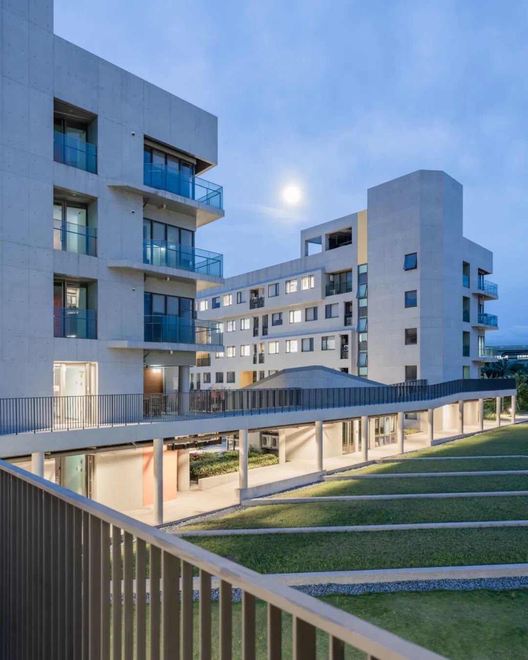 学院的规划设计,首先是对此自然基底的回响:以生态永续为核心原则,致力于最小化环境干扰。设计策略性地主动顺应基地北低南高的地形特征,将校园划分为「教学行政」与「生活住宿」两大区域。