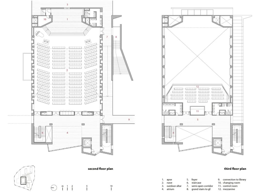 空间上部设有天窗,让全天候的漫射光线照亮讲台,使其与大堂形成明暗韵律的对比变化。当主墙上明亮的十字光影投射至空间深处,教堂内氛围更显宁静安祥,体现真实、平安之感。