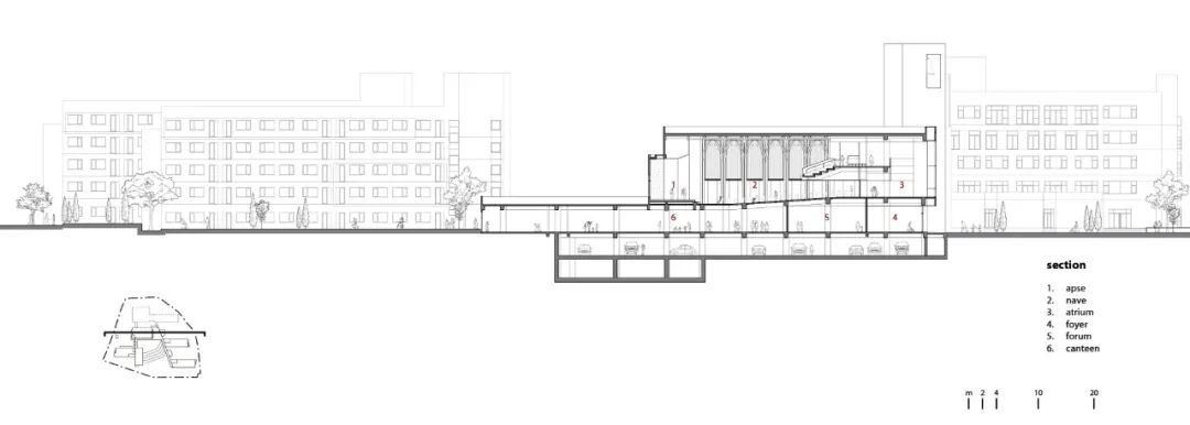 ▵从默祷花园看向教堂栋,建筑体量采低矮分散的配置