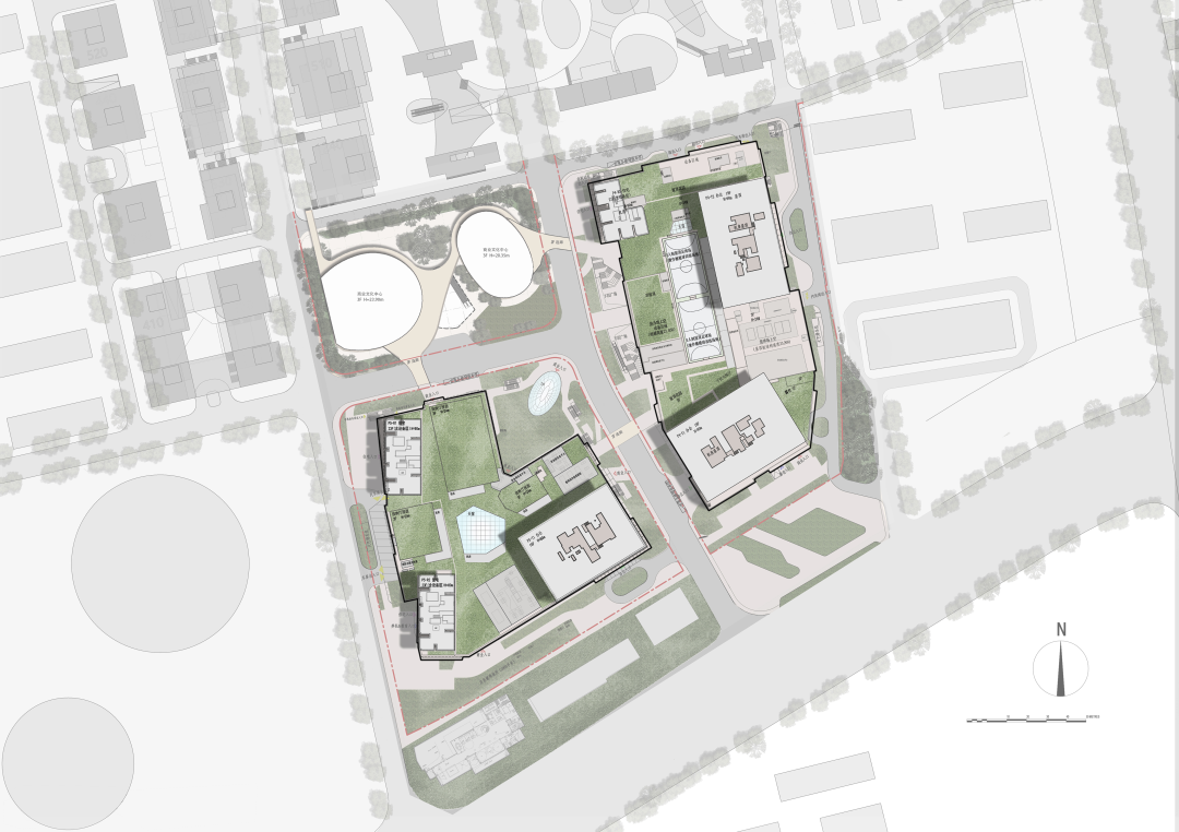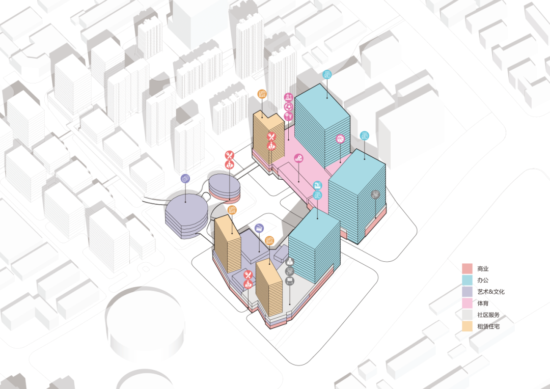 面对分散的地块,我们的核心设计策略是 “缝合与闭环”。项目所处的两个地块以及西北3B# 地块的艺术中心通过地上和地下连桥紧密相连,形成功能流线上闭合通路,使三个地块建筑融合为一个整体,更激活了各业态间的化学反应,形成了1+1+1>3 的能效。