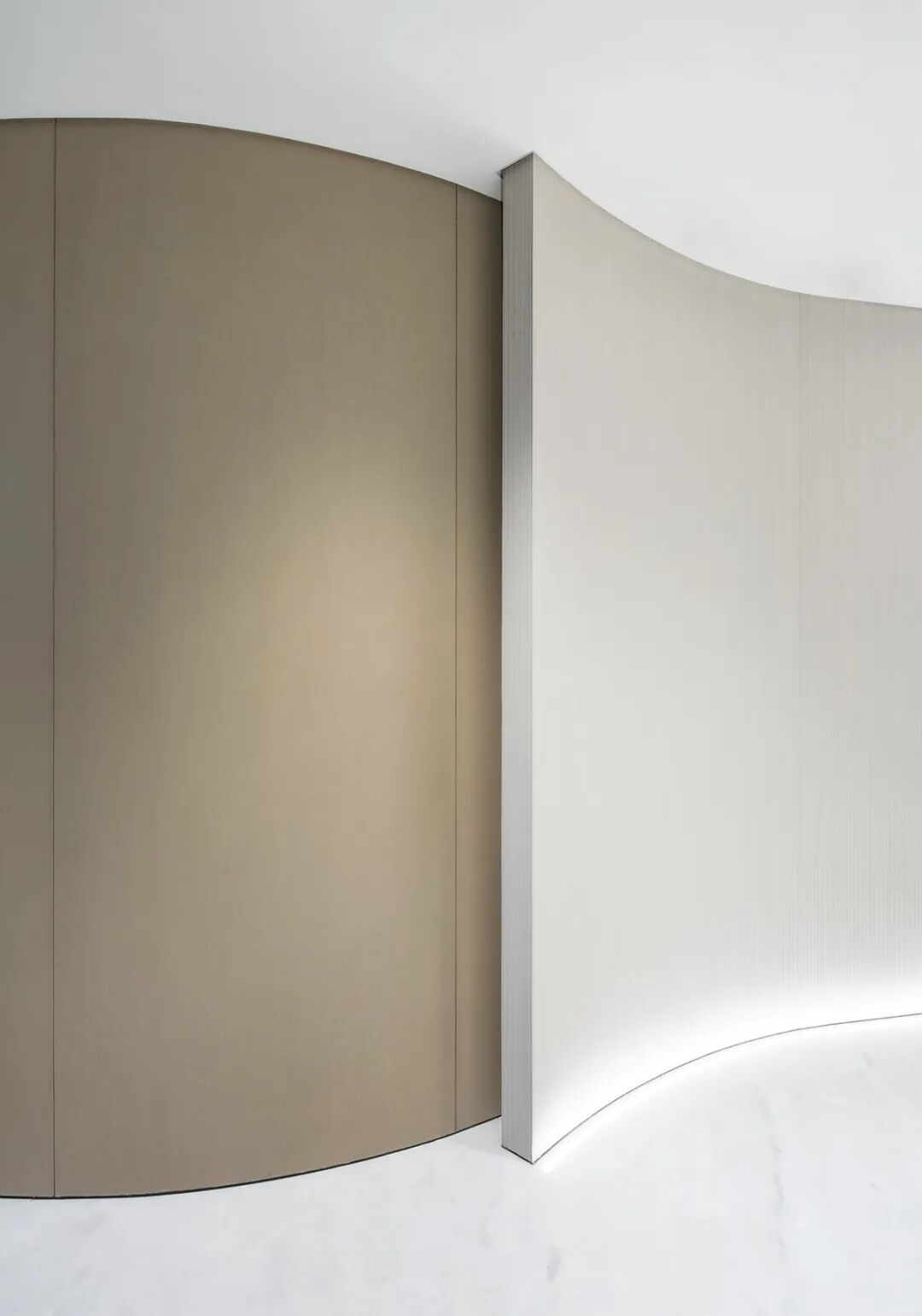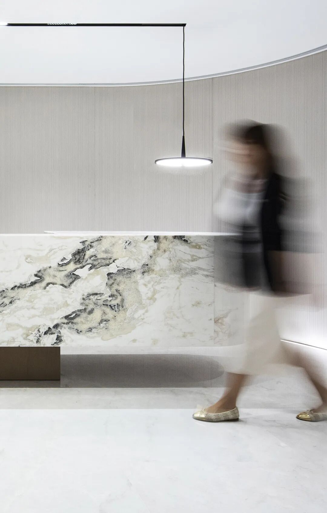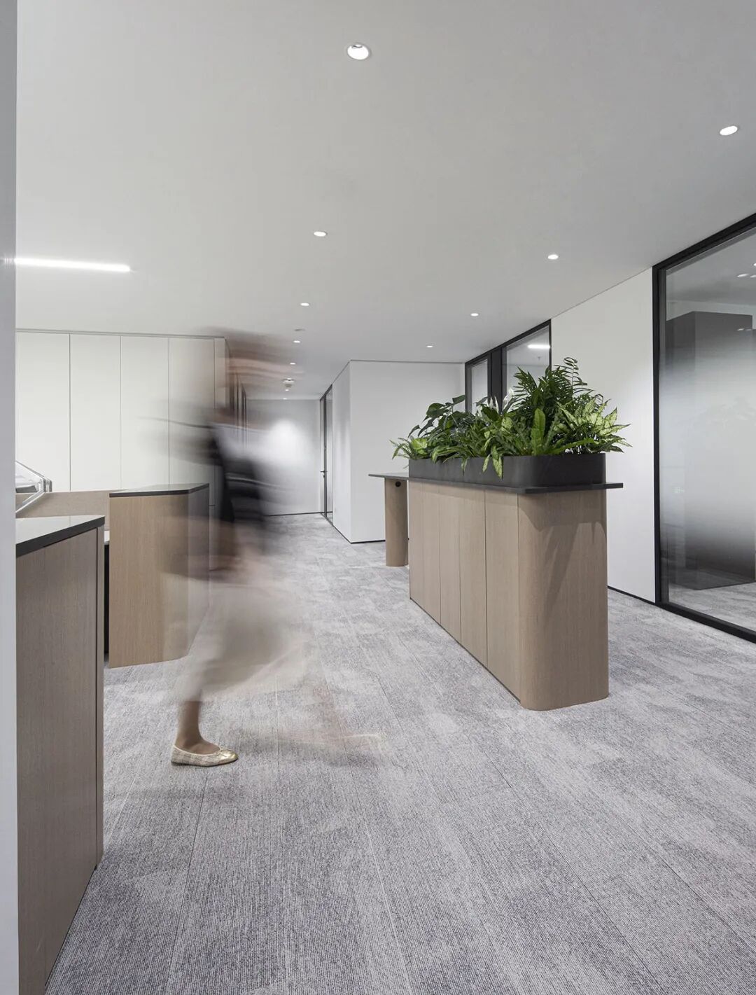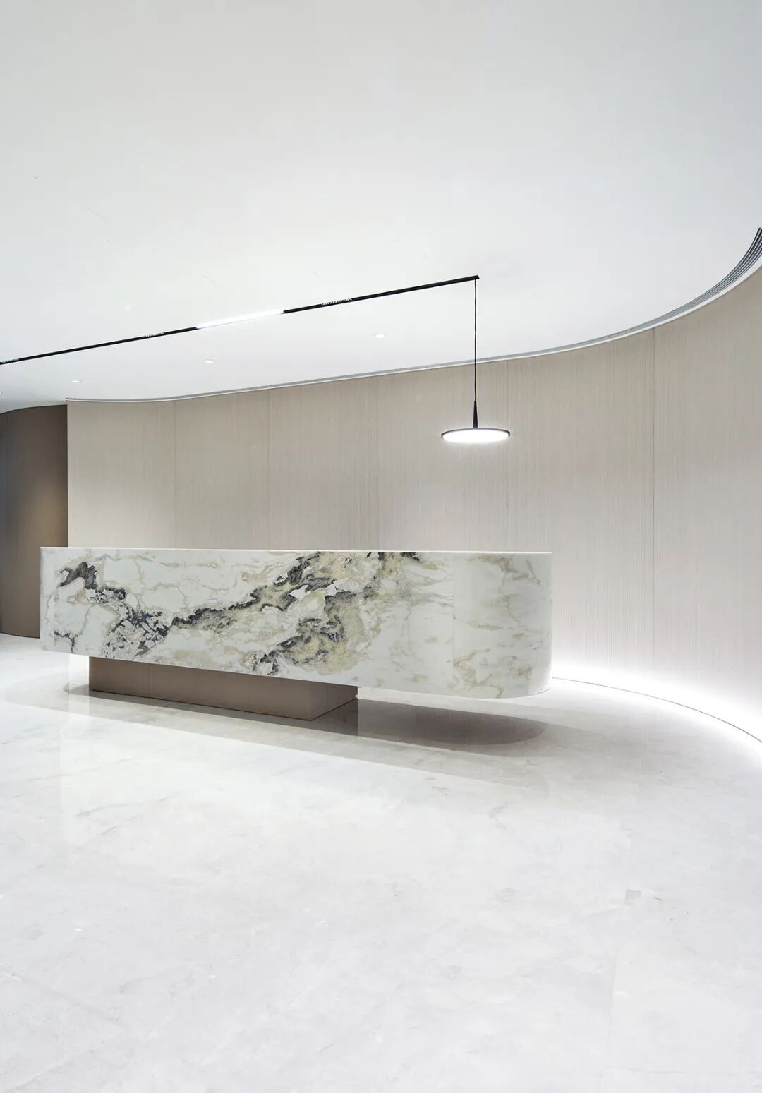 入口的巧思打破边界,走廊与办公区视线无碍相连,让通透成为空间的底色,光线循形而入,暗合“让光线来做设计”的初心,既引访客目光从容而至,亦让专业的气场不彰自显。用材不求奢繁,但于细节处见功夫,恰如律法之事,于细微处见真章。前台一隅,大理石的肌理与空间相融,成点睛之笔,石的沉稳与光的灵动相映,勾勒出专业与雅致的平衡,是视觉的焦点,亦是律所气质的凝练表达。