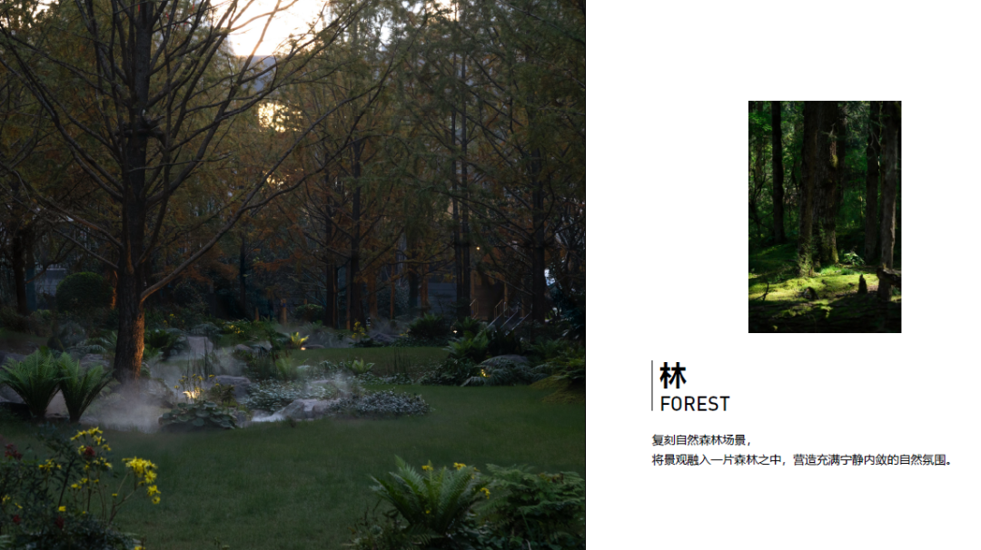 这里是林木包裹下的森林空间,有形无界的场域。生活随四季流转,成景入画,演绎一场自然时序里的场景美学叙事。