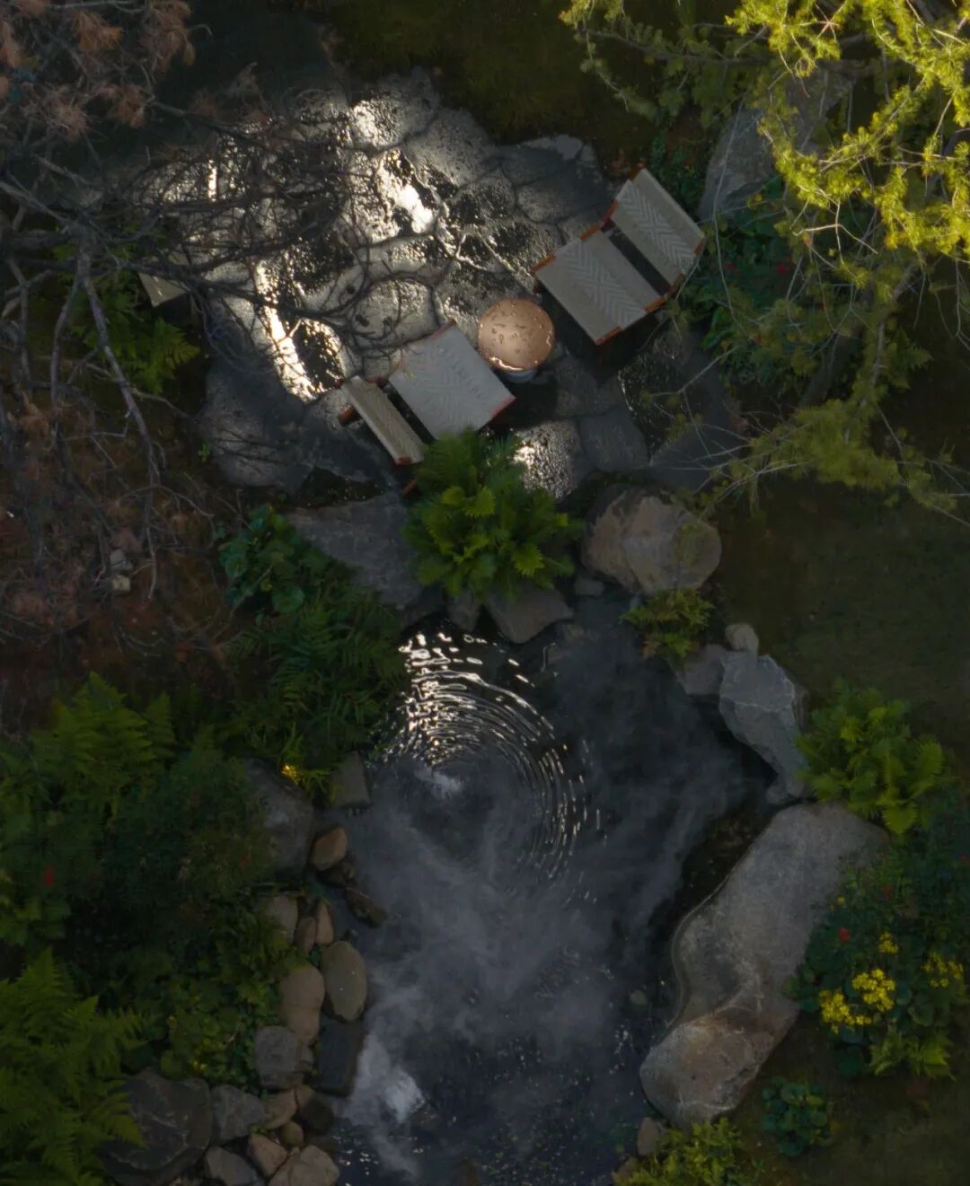 茶亭浮于潺潺流水之上,透光云石为,阳光穿林,将斑驳树影轻投帘间。这流动的光影,是独属于居者的私人时序——或立于岸,或坐于亭,四季在景框间静静流转。