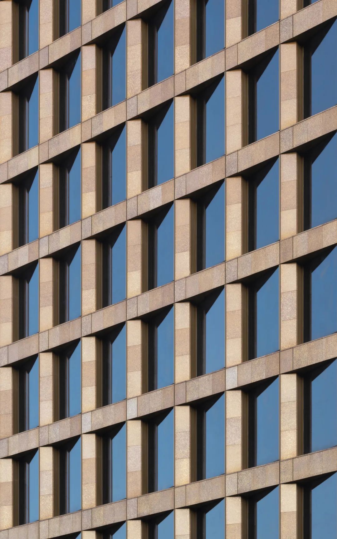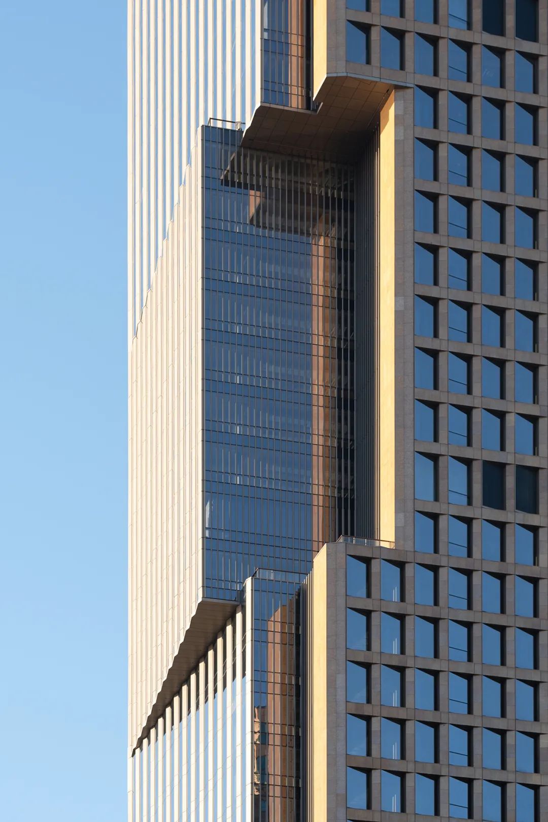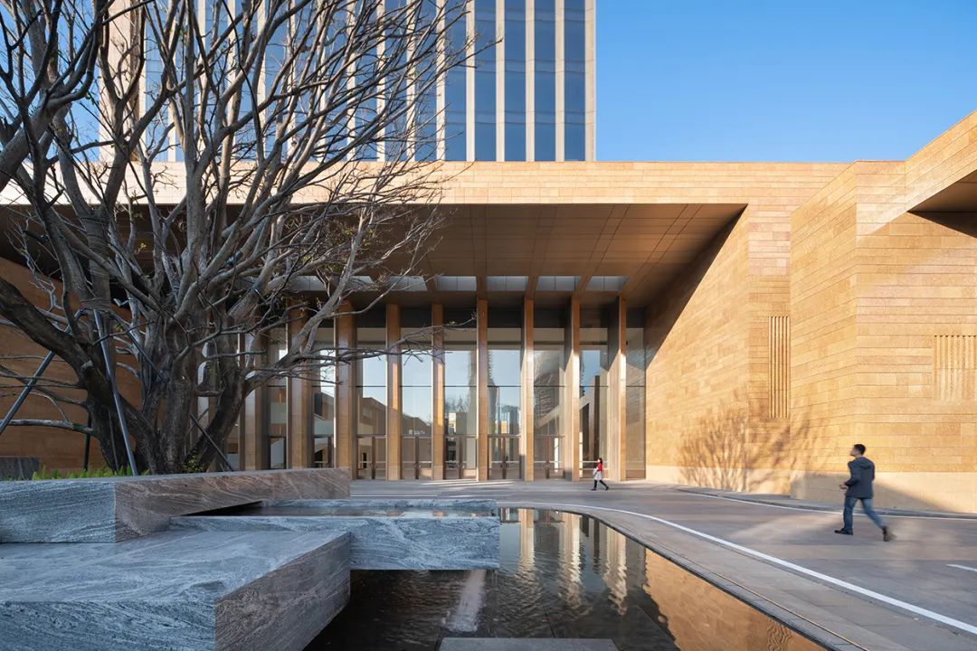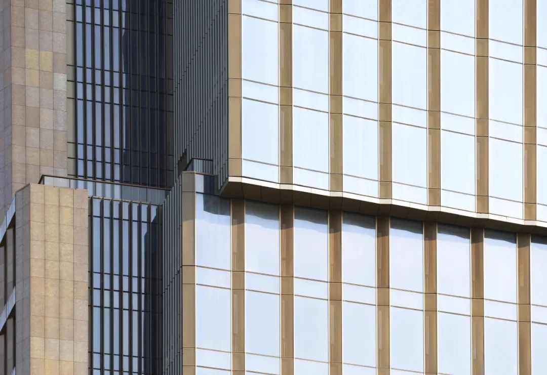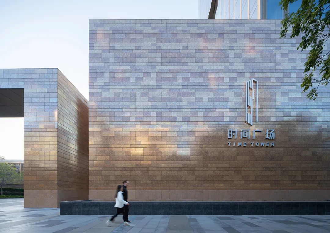 楼塔和裙房都采用了陶板材料,遵循低碳设计的策略。定制设计的釉料与邻近的塔楼的粉红色花岗岩相得益彰,并在不同光照下呈现出色彩斑斓的效果。