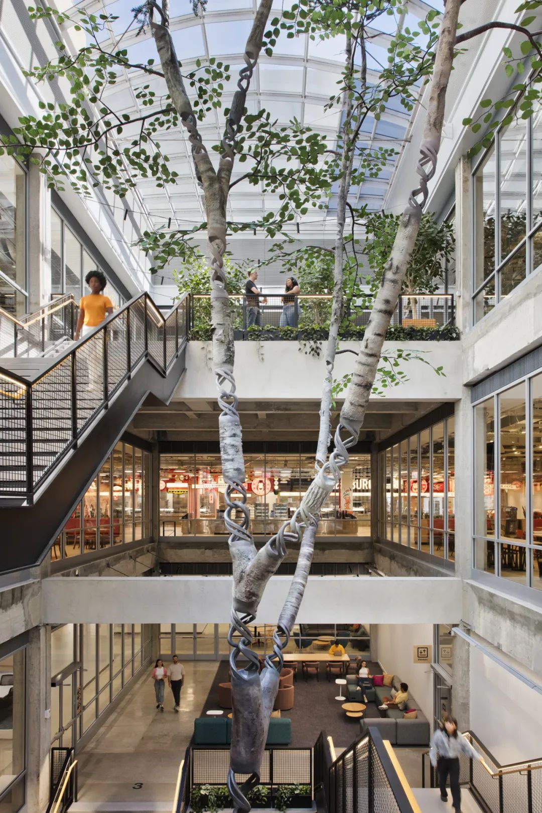 对于在疫情流行年份设计办公空间,尤其是为一家同时不断投资于元宇宙虚拟模拟世界的科技公司而言,关注物质实践和空间过程的密切程度,都包含了一定的深意。Kassem提出了一个关键问题:“疫情后时代人们回到办公室时,他们会因为什么而回来呢?什么能够创造相遇和共同体?”在她的团队进行设计时,她深思熟虑:“对于我们所有人来说,这更加凸显了日常实践中物质和触觉的重要性,这也影响了我们对体验的思考。”对于元宇宙持悲观看法的一种愿景是,集体幻觉取代或隔离自己,不再与公共共享空间有联系。