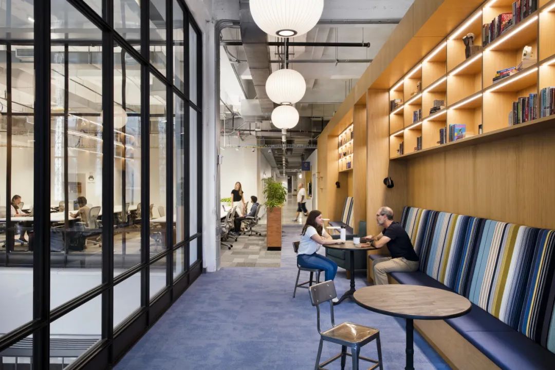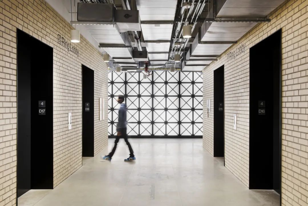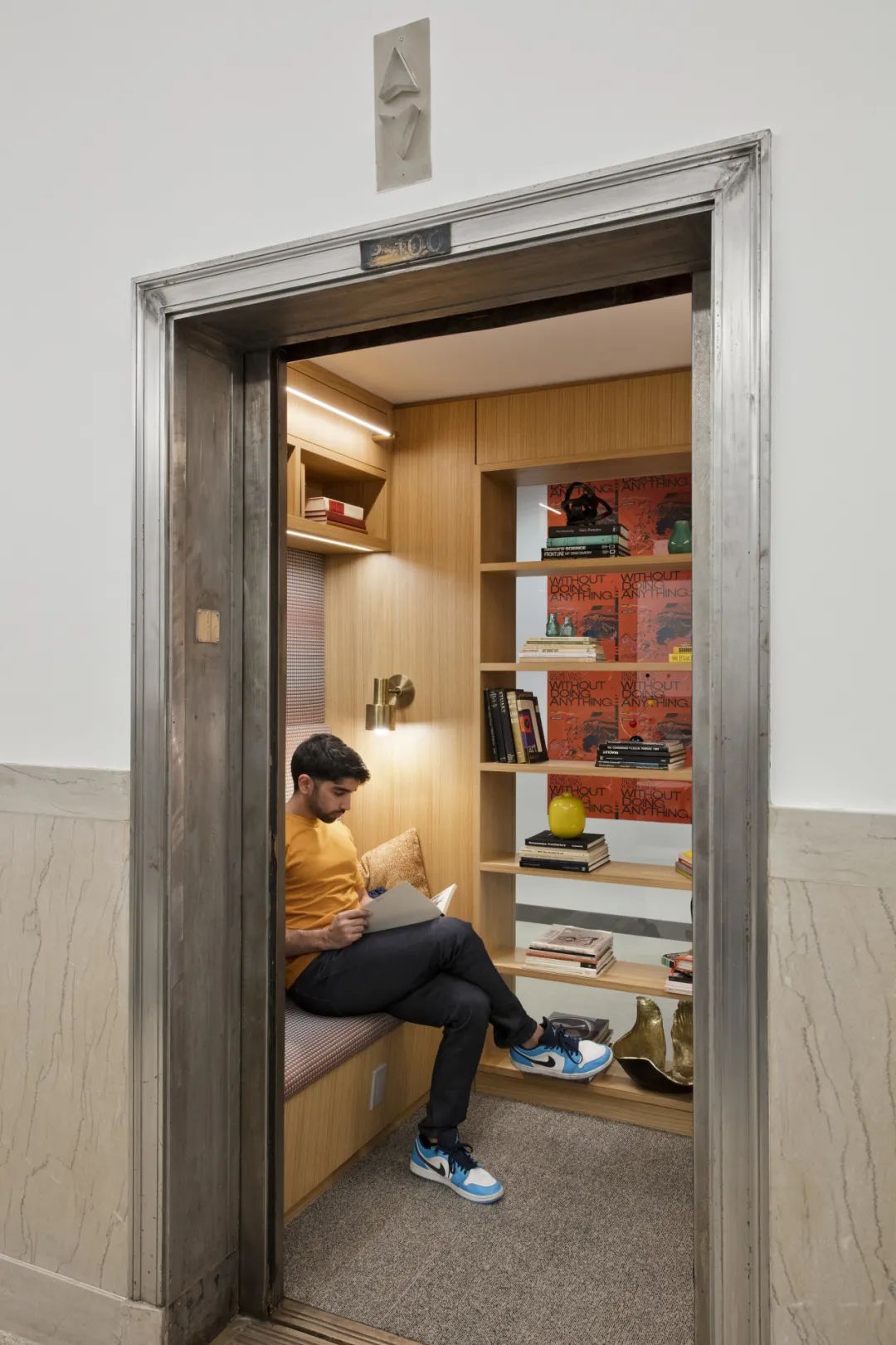 对于历史走廊和电梯大堂的创意再利用,使得另一层独具特色,保护这些元素是必需的,这是根据1965年市政地标法要求的,正是在旧宾夕法尼亚车站拆除之后通过的。这种处理将一种必要性变为了一种美德,通过将历史电梯轿厢变成阅读角的奇异戏剧性,或者是一个被修复和重建的带有玻璃顶灯和门楣的走廊,在周围的办公景观中,看起来就像电影中的黑色背景。还有其他现成的元素,Kassem称之为具有“车库美学”的,其中包括保留了KPF发现的大堂和中庭周围的铁筋混凝土结构框架。