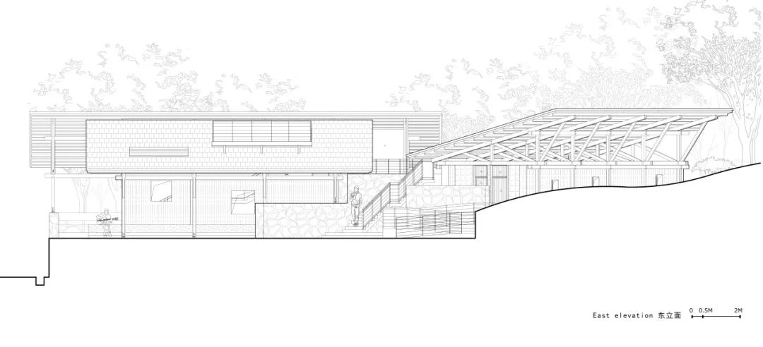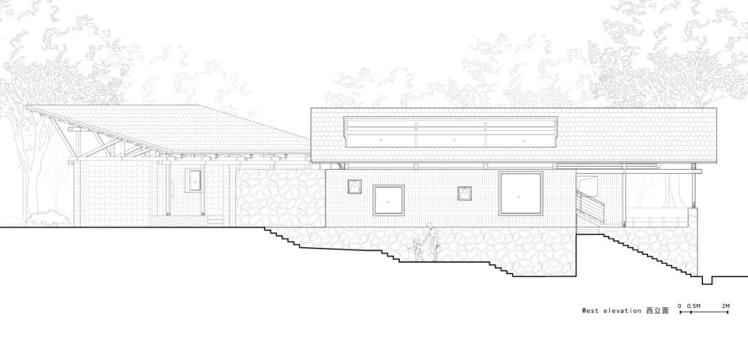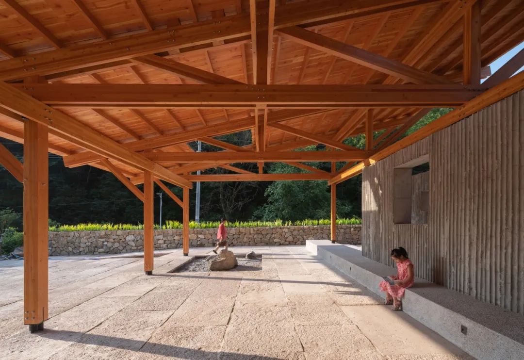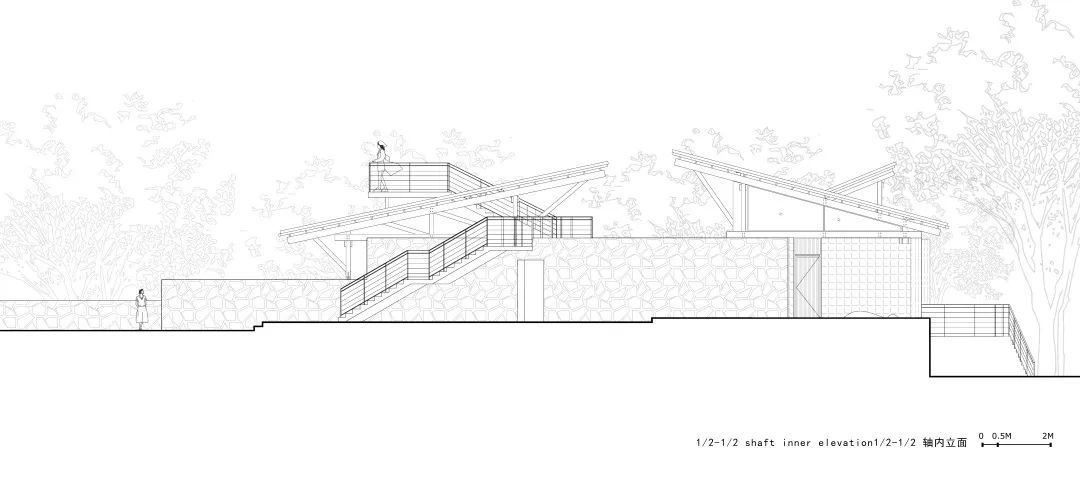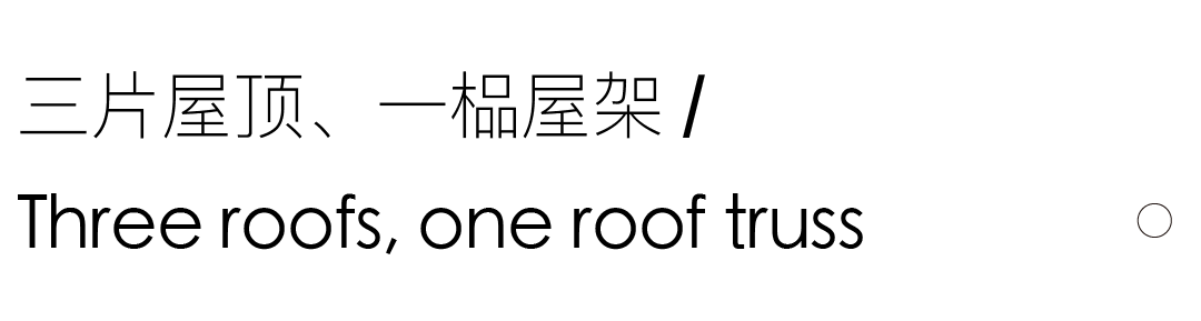 The architectural design clearly separates the basic elements of the house, the roof, the structure, the walls and the ground. The functional spaces are distributed under three big roofs, namely the public reception, open public space and the public toilet, which are both independent and interdependent, and are systematically organized. The big roof is built on prefabricated plywood roof truss at different scales that repeat and evolve from the coherent design logic and form, similar to the traditional Chinese wooden buildings, which changes within the continuous array of roof trusses. A standard roof truss is designed and repeated to be arrayed for scale change according to the space, and therefore, a spatial relation of three basic wooden roof trusses is created.