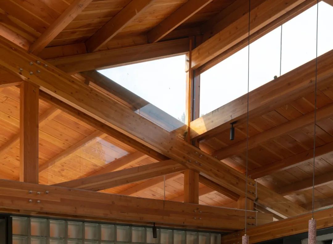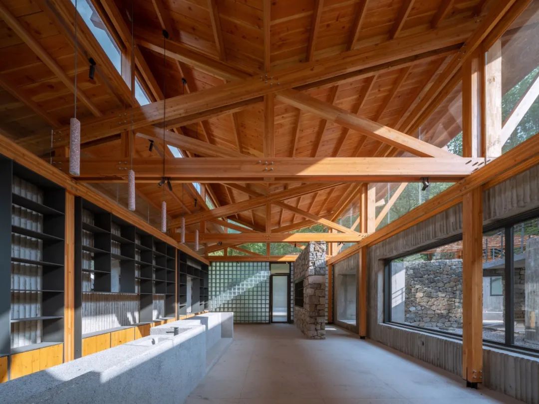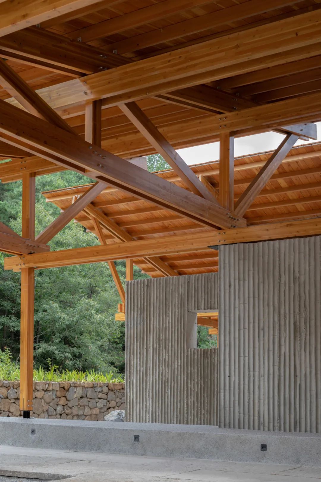 建筑设计将房子的基本要素拆分的很清晰,屋顶,结构,墙体,地面。使用空间分布在三片大屋顶之下,分别是接待公区、开放的公共空间、公共卫生间,三个功能既相互独立又发生关联,有机的组织在一起,大屋顶由预制化设计的胶合木结构屋架构建而成,不同的尺度,同一种设计逻辑和形制进行重复和演变,类似于中国传统的木构建筑,在连续阵列的屋架中产生变化,设计研究了一榀标准屋架,然后将屋架进行阵列,根据空间尺度形成尺度变化,就形成了三个基础的木结构屋架空间体系。