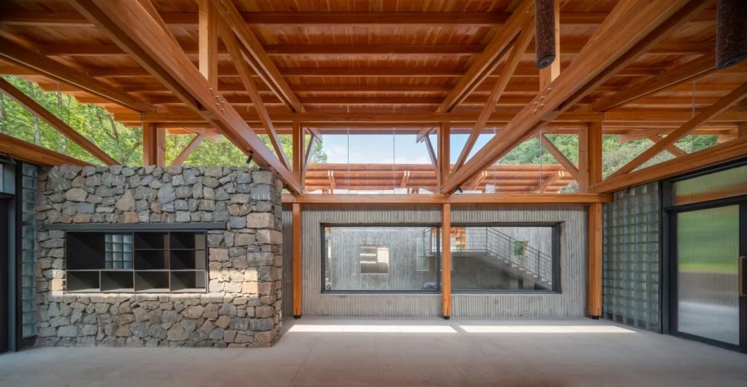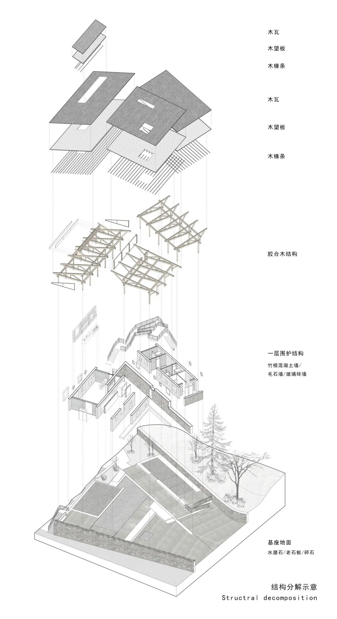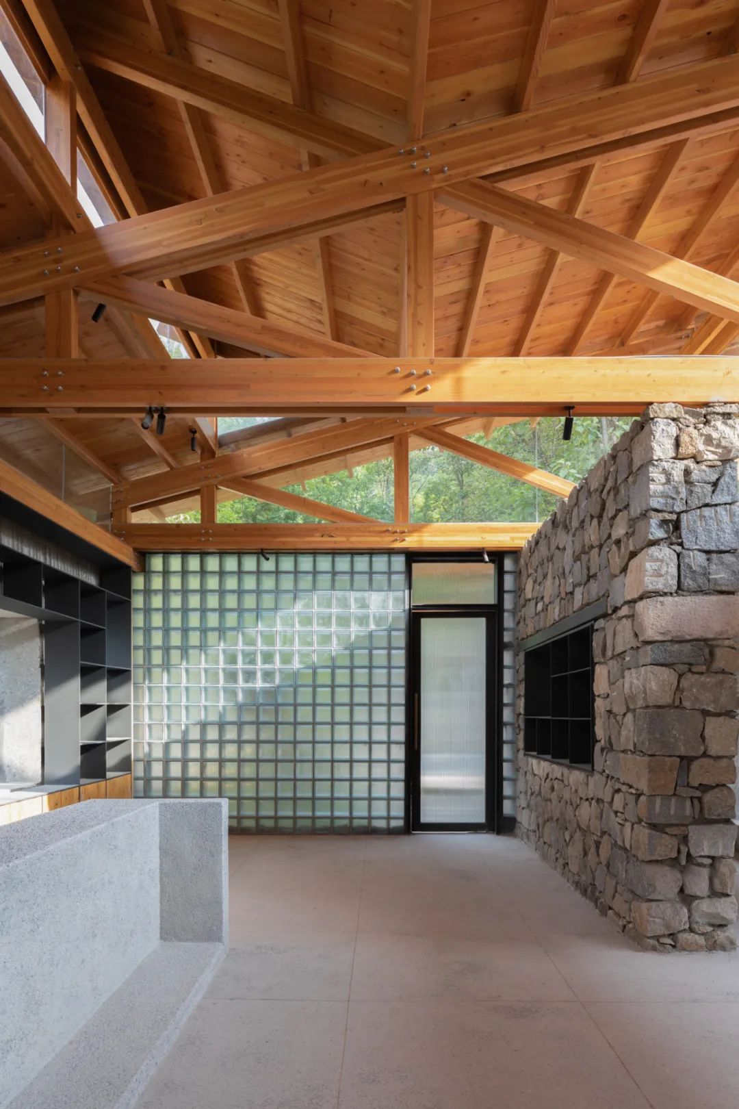 真实的建造一定会打动人,事务所实践作品中一直在追求真实的建造,而这个建筑算是基本实现了这一点。在设计之初,我便希望用最真实清晰的思考方式去进行设计,建筑的所有空间、构造、材料、交接关系都能清楚的被呈现和表达,不希望有任何装修的做法,让人进入空间之后就能想象到整个建筑的建造过程。石头从下至上慢慢垒砌,混凝土竹子支模板现浇,木结构工厂加工现场组装,老石板一块块铺设,玻璃砖一块块砌筑,能清晰还原整个建筑建造的过程,于我而言,能实现如此清晰真实的建造表达,是做这个项目最大的收获。
