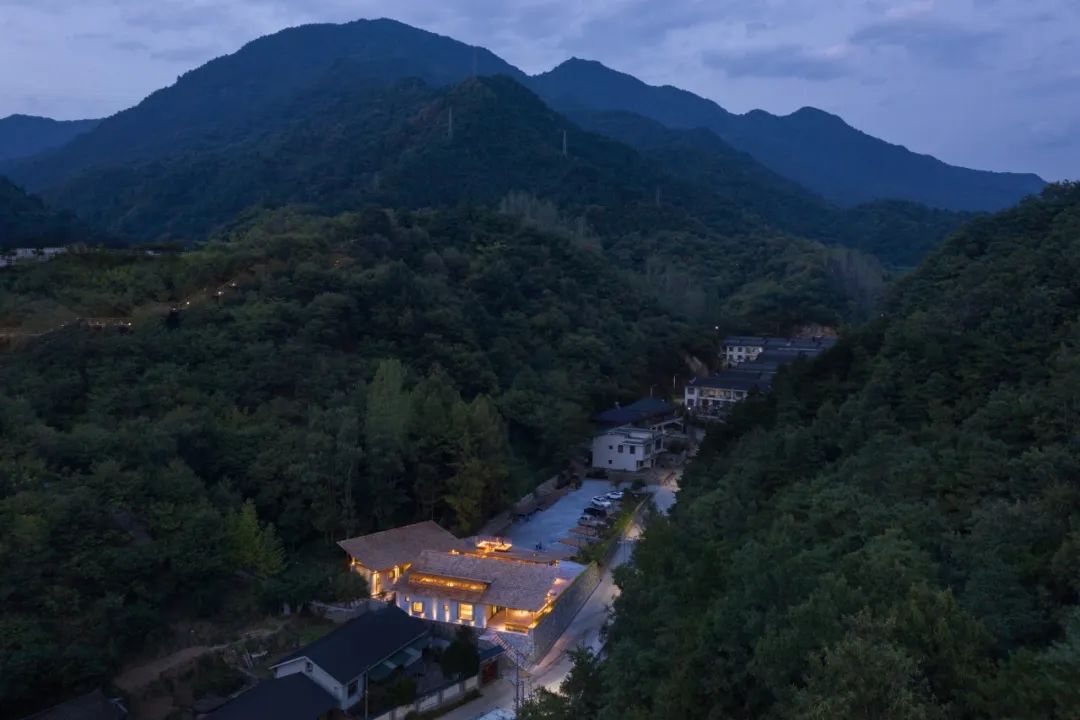 第一次到现场是4月的一个阴天,远山朦胧,现场两幢横向的红砖房在不同的标高上,呈60度角摆放。场地两侧的山挨得很近,给人很强的被包裹感。从场地内空地顺山坳望向远处,只看到屋顶之上的远山,场景干净。从现场记忆中我提取出来最核心的两点要素:建筑的落位轴线以及看山的方式。新建筑延续了原有的建筑肌理和轴线,希望找到原有场地的记忆。顺着山边的轴线布局了一个体量作为卫生间,用一道特殊的墙体将功能和空间切分开,上山道顺着墙体穿过建筑,方便游人使用。石头墙体的左侧是接待公区和半室外公共空间,顺另外一条轴线布局。建筑里面有多条流线,一条沿着建筑左侧不经过建筑内部道路直接上山,另一个选择是进入建筑内部,有多条路径可以通行上山。纯粹的看山方式通过一片斜向的屋顶引导视线看向远山,屋顶上设置一观景平台,登高望远,回看环山。