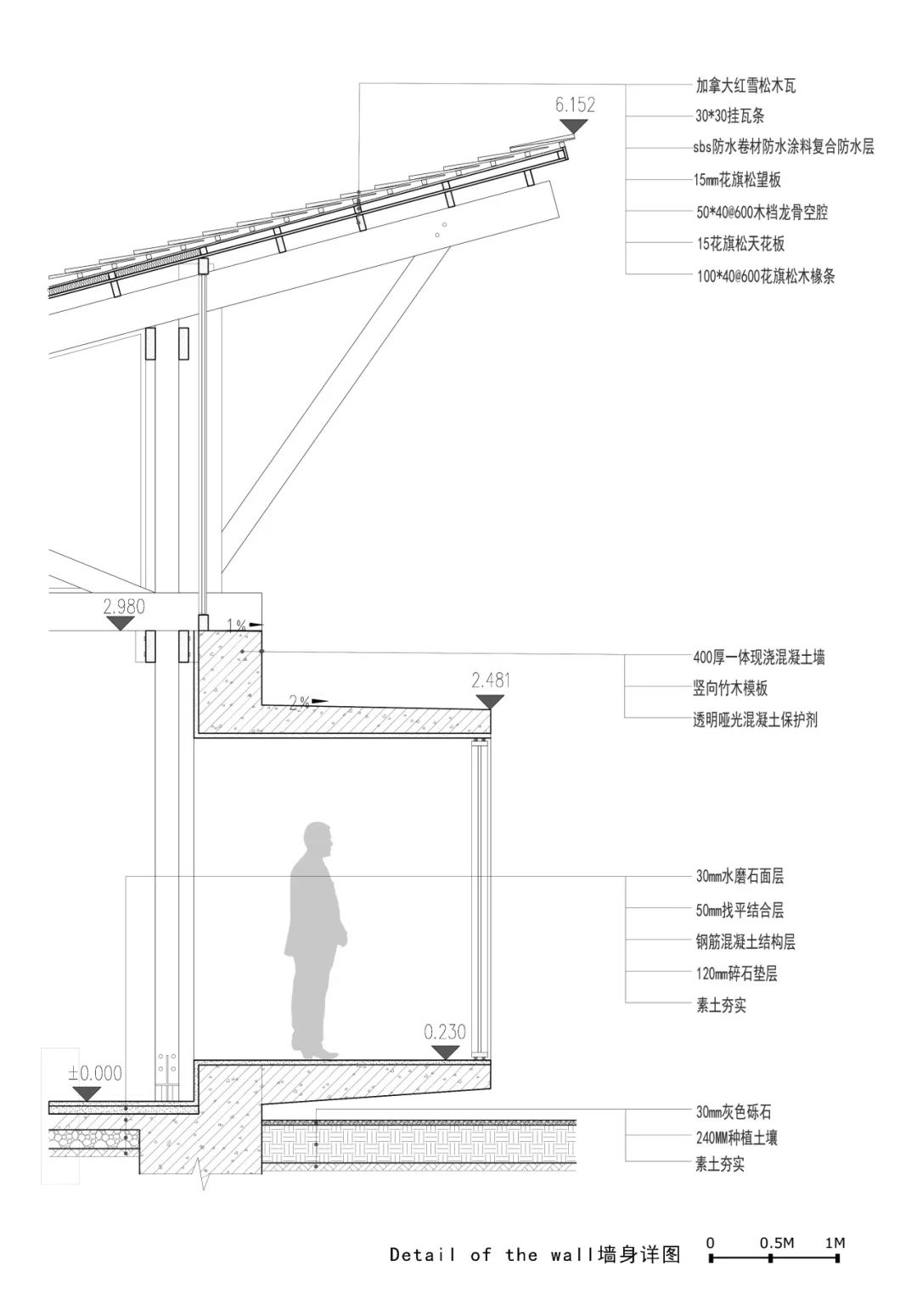 建筑材料:花旗松胶合木、竹模混凝土、毛石砌块、红雪松木瓦、玻璃砖、老石板、钢板、水洗石、水磨石
