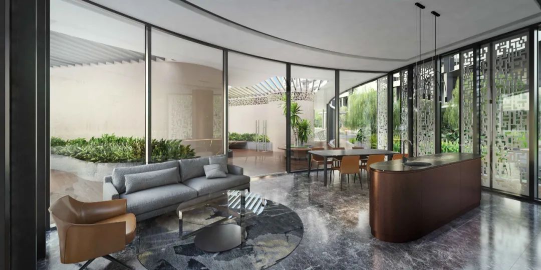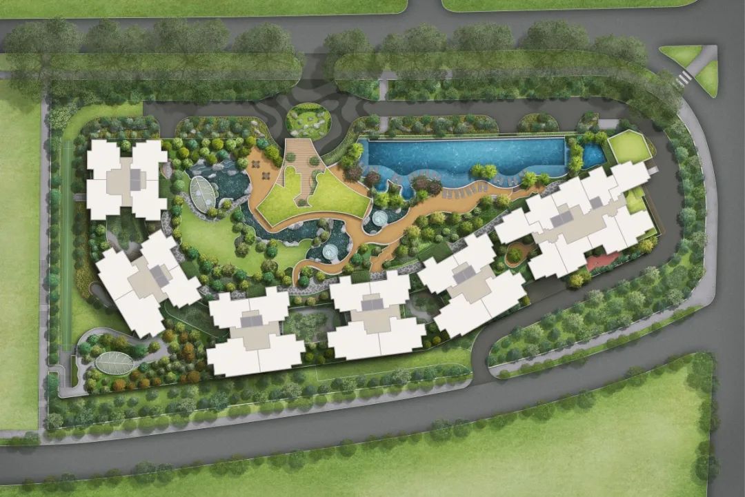 项目包含六座12层的住宅塔楼,每座塔楼从地面抬高11米,错落布局,形成了独特的波浪形曲线,犹如荷兰山起伏延伸的绿色景观。总体规划精心设置了塔楼朝向,确保每个住宅单元都能无遮挡一览游泳池和另一侧的葱郁山景。将近83%的住宅是边户户型,视野宽阔且通风透气。The development boasts six 12-story residential towers elevated 11 meters above ground, forming a unique waving curve design that follows the undulating greenery of Holland Hill. The masterplan is carefully arranged with the towers positioned to ensure that every residential unit enjoys unblocked views towards the swimming pool on one side and the lush hill on the other. As much as 83% of all units are corner units, providing residents with wide views and cross-natural ventilation.杰出的塔冠设计犹如荷兰村天际线上的一道靓丽风景。立面采用了往常用于奢华酒店的通高玻璃幕墙,以精致的工艺打破了室内外的空间界限,将怡人风光带入室内。透过幕墙,住户可以无阻碍地欣赏周边的自然美景,将绿色宁静带给每一户家庭。设计特别采用了高质量夹层玻璃,减少阳光透射率,更为节约能耗。The towers' outstanding crown design makes a strong statement in the Holland estate skyline. The full-height glass curtain walls, usually reserved for luxury hotels, bring exquisite craftsmanship into private homes – creating a seamless flow between the indoors and outdoors. The glass walls provide stunning views of the surrounding natural beauty, imbuing the serenity of nature into every home. High-quality laminated glass is used for the curtain wall to reduce sunlight transmission and improve energy efficiency.Aerial view of Hyll on Holland