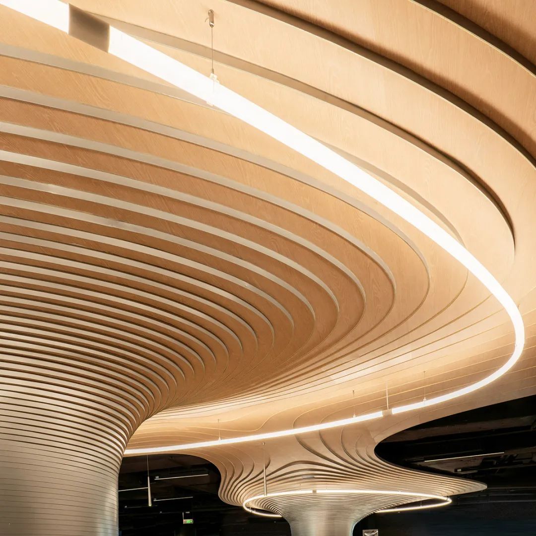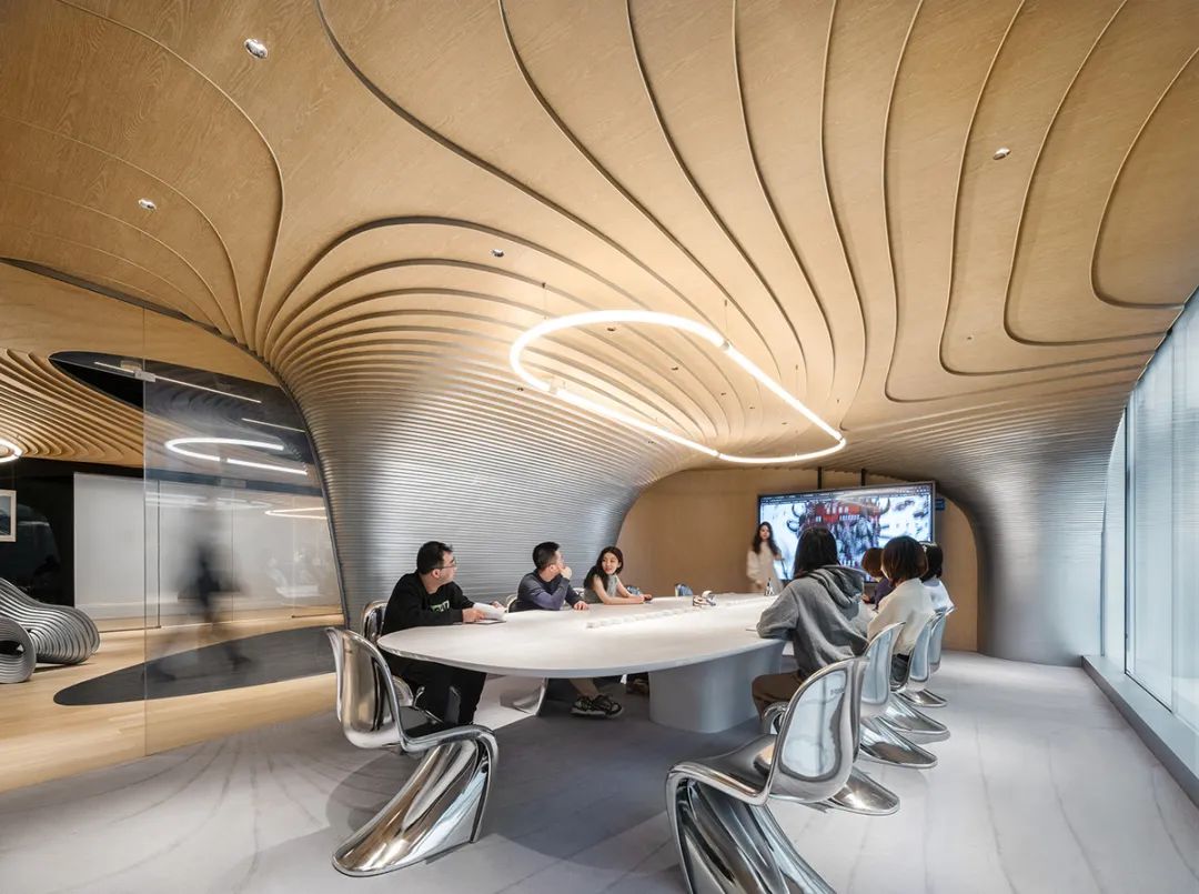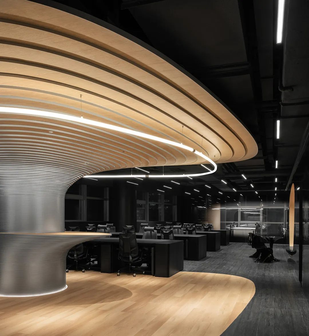 近日,由零壹城市(LYCS Architecture)室内、软装一体化设计的灵游坊办公总部正式投入使用。项目坐落于北京海淀中关村中国电子大厦,总面积约1,500 平方米。飘渺的曲线发出神秘的光芒,在半空中仿佛一座异世界入口一般夺目。
