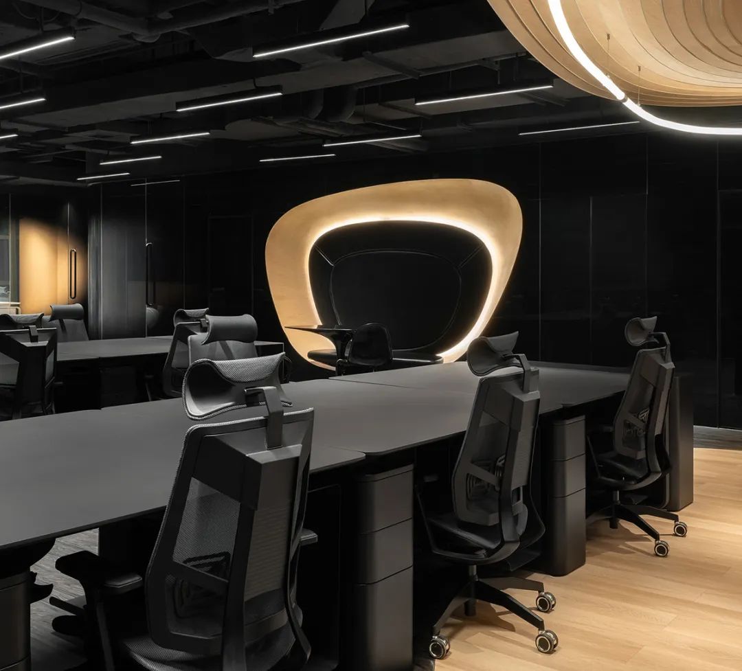 黑色地板,黑色墙壁,黑色桌椅……不同灰度与媒介的黑色给空间以丰富的质感及层次感,黑色使得空间感似乎无限延伸。低流明暗黑美学与办公空间的结合令人印象深刻,恍惚间好似踏入了影境的游戏世界。