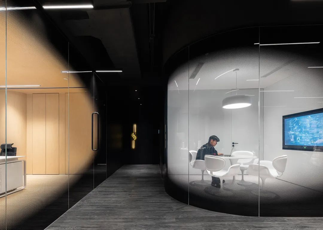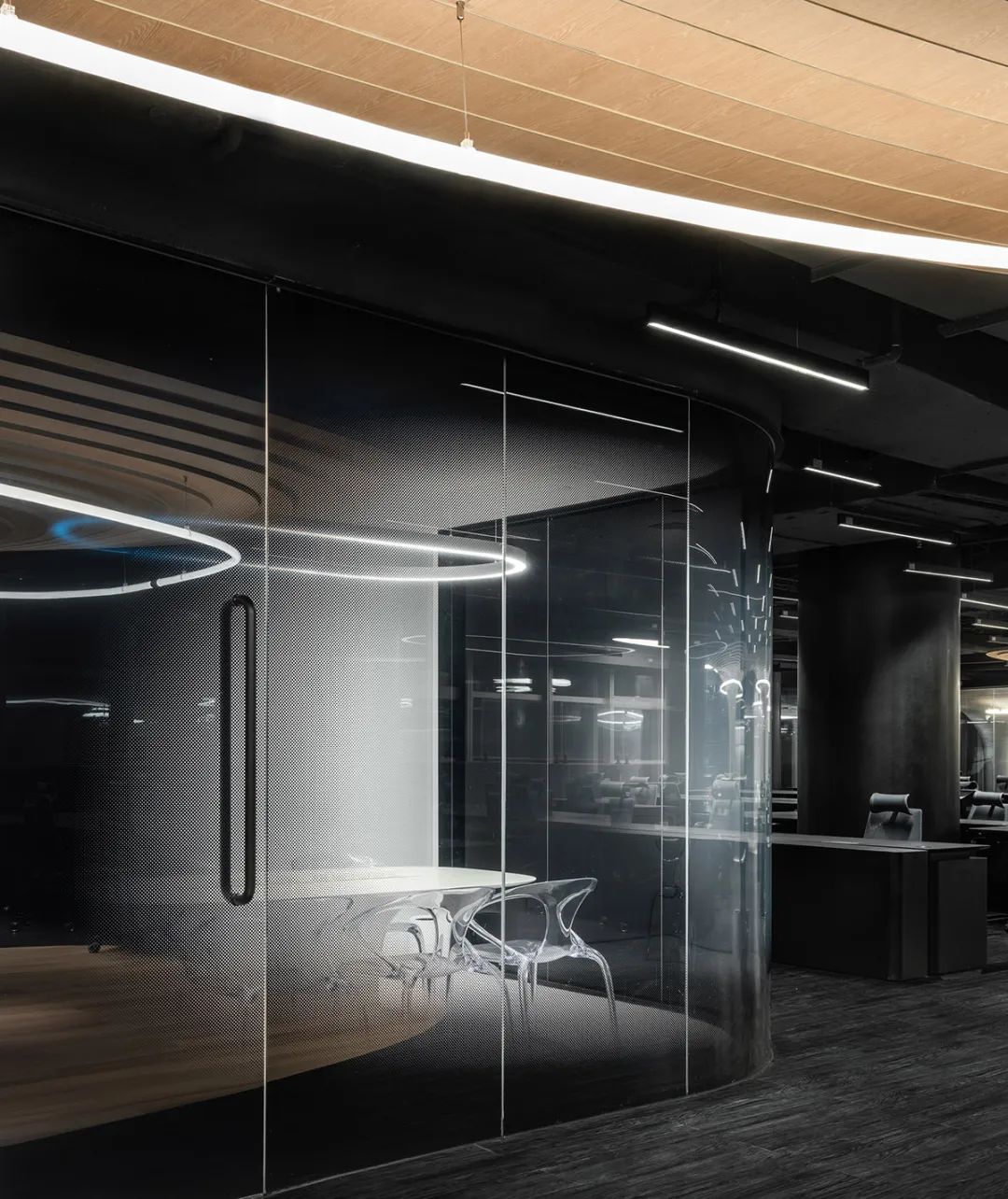会议室采用了定制黑色渐变玻璃作为隔断,仿佛玻璃泡中的一座座开启的小世界,给办公空间覆上一层虚幻的色彩。