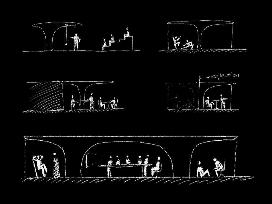 在能量体的树冠笼罩下,自然而然的划分出会议室、接待区、洽谈间、水吧区等社交空间。