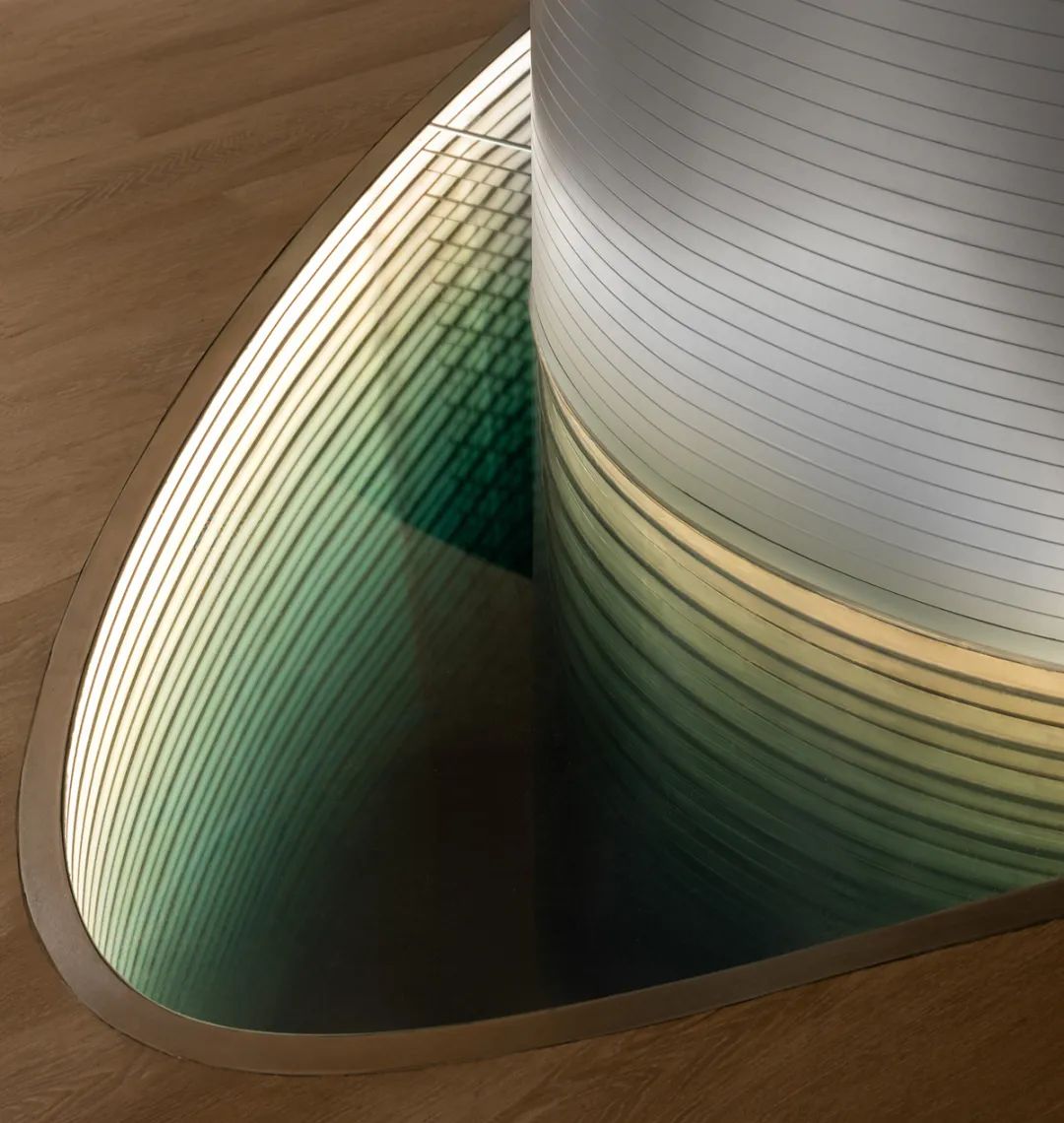 办公区入口能量体下是全办公区最“危险”的所在,设计师将无限镜与能量体结合,通过镜面与灯带将光线无限反射,创造出空间无限向下延申的视觉效果,激发出打破常规的想象力,使得这片休闲区充满趣味性。
