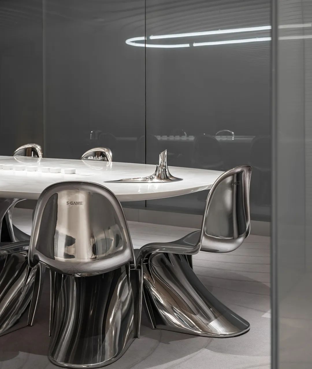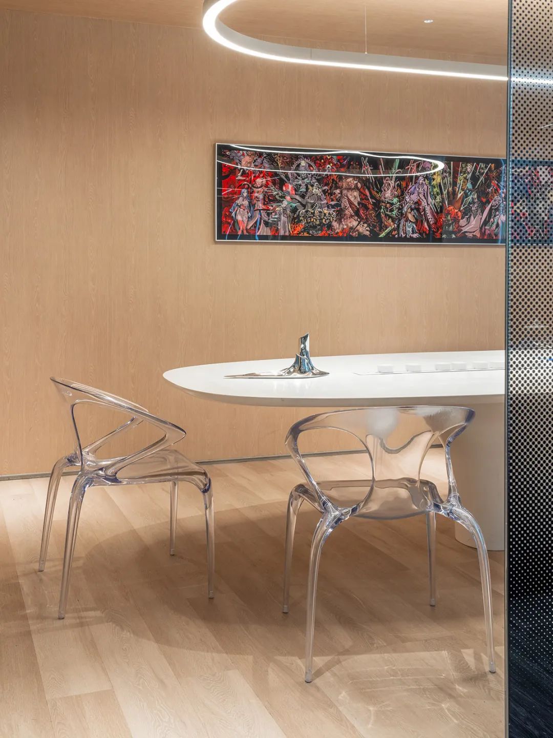 会议桌由设计团队原创设计及定制,用人造石拼接打磨呈现出一体成型的效果,超大的悬挑桌面确保员工们在开会时腿脚的舒适空间;椅子来自Roche bobois,AVA椅流畅的曲线造型及透明材质带来的消失感与空间气质完美契合。