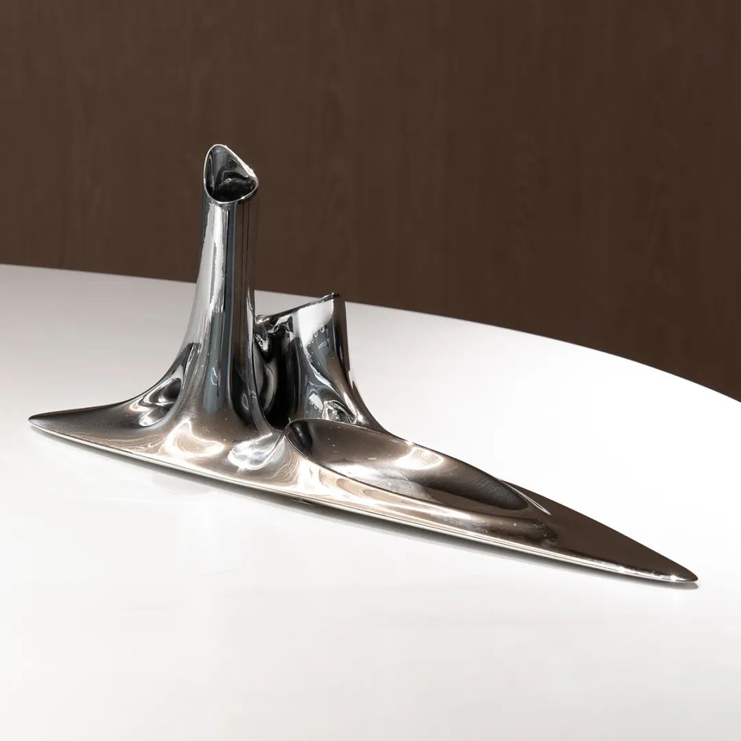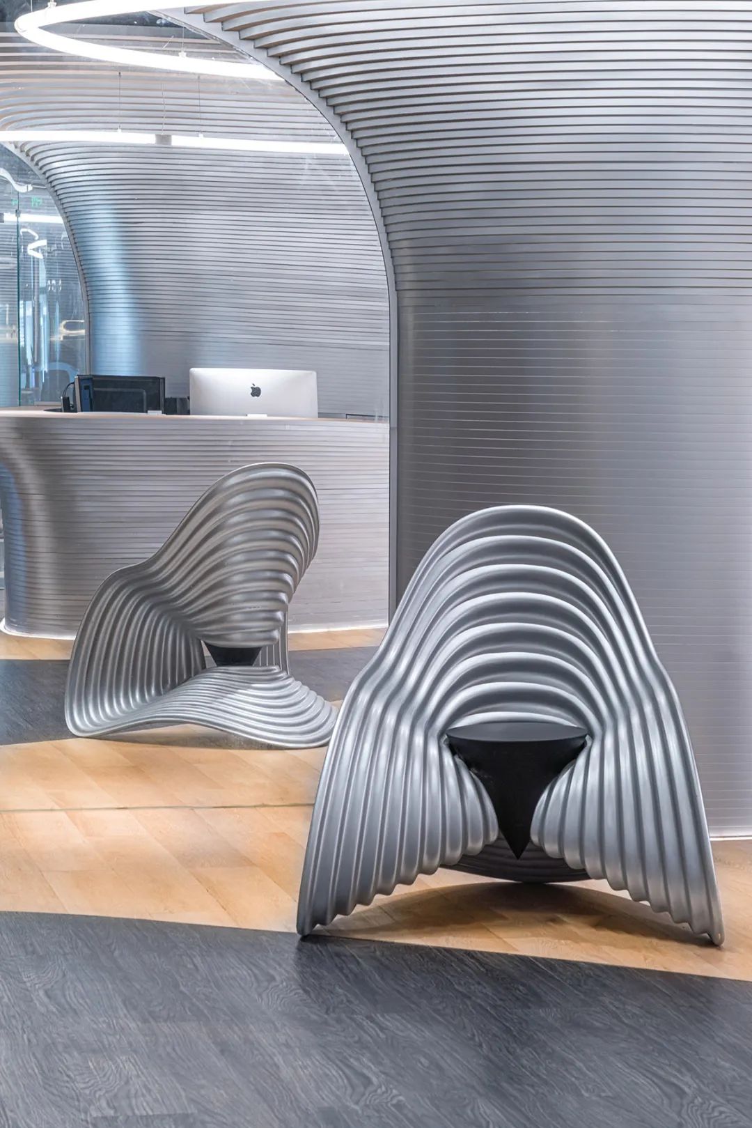 公司入口处两把重达300-400斤的金属椅子,椅背、扶手和椅脚融为一体,波浪形的曲线仿佛无限循环。
