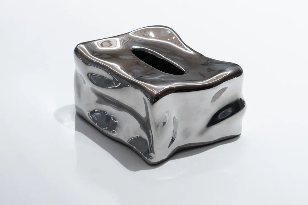 笔筒、纸巾盒如同融化的金属在桌面流淌。