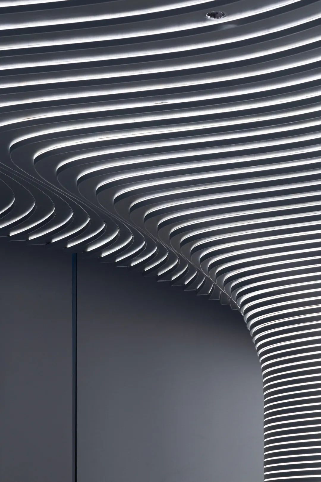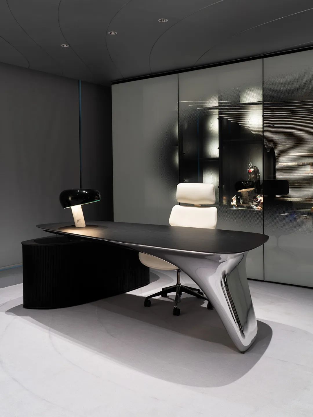 黑到极致是白色,夜的尽头是白昼,位于办公室尽端的总裁办公室,由纯净的白色构成,银色地毯,银色桌椅,银色金属屋顶,自由的曲线由地面延伸至整个空间。