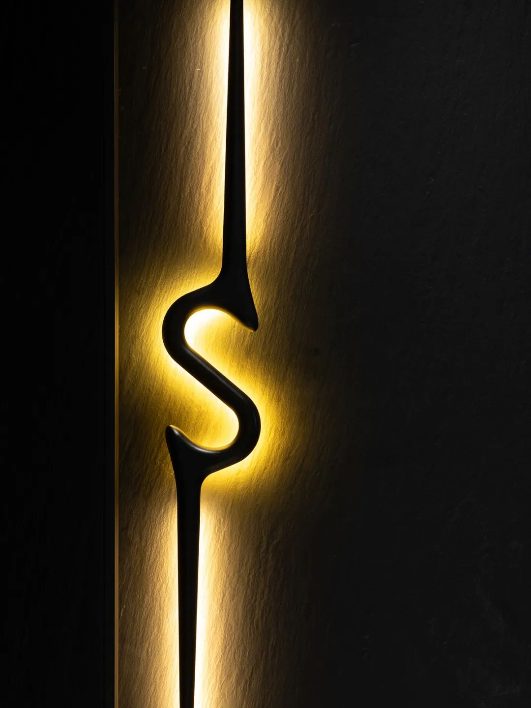 总裁办公室的S形门把手由灵游坊logo演变而来,同时暗合灵游坊创始人SoulframEE,背光亮起,好像一把神秘的战刃一般浮现于黑色石材岩板之上……