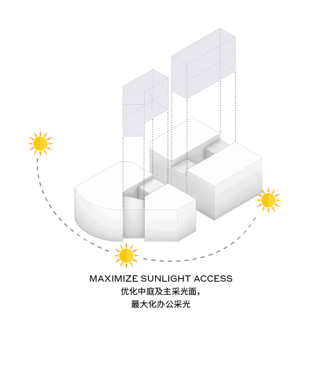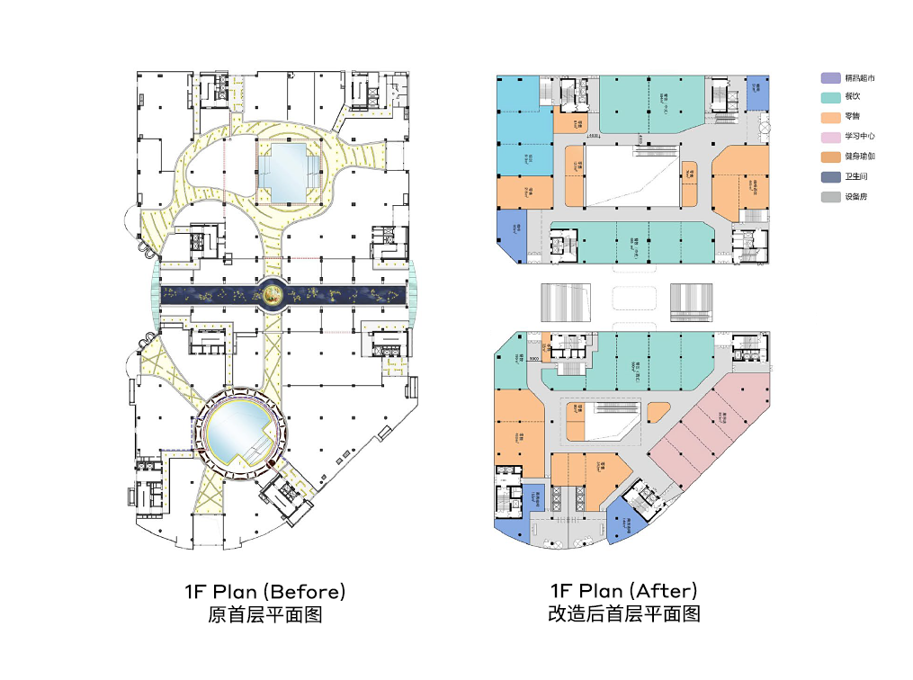 在“新办公+新零售”的理念指导下,两栋塔楼之间增设了下沉广场,首层和地下层提供餐饮及其他便利设施,二层改造成为办公交往空间;升降梯替代了商场原本的自动扶梯;商场的圆形中庭改造成为适应办公需求的矩形中庭,挑高通透,给予空间充足的自然光照;简单高效的楼层平面则可为未来租户提供最大灵活性。
