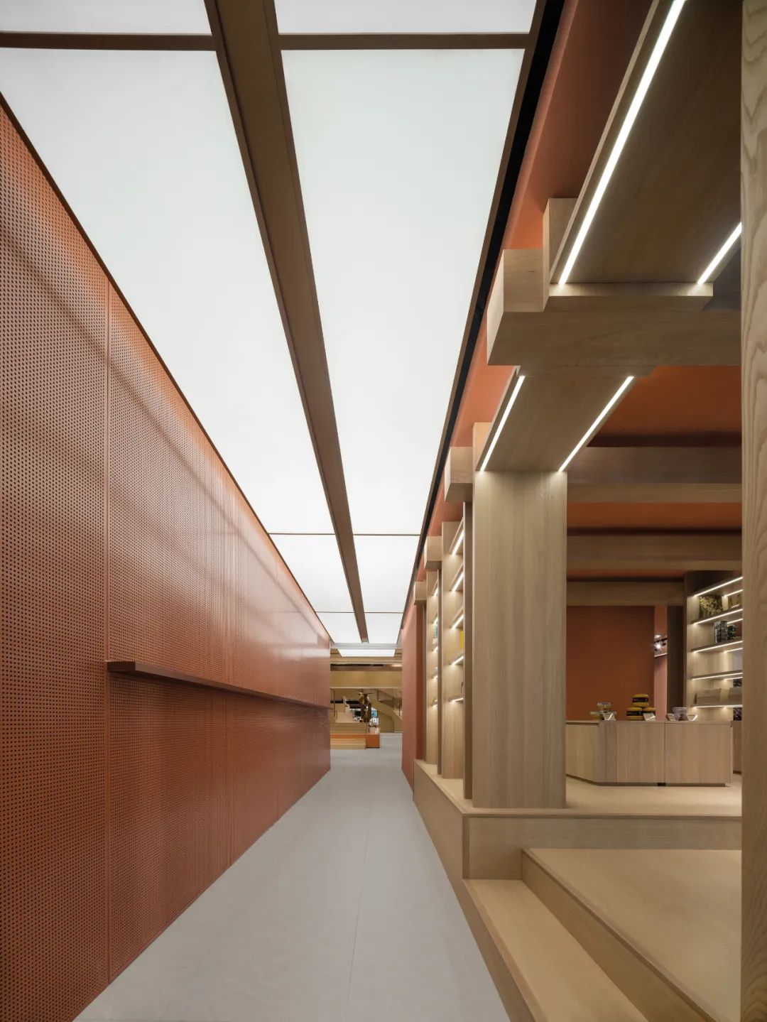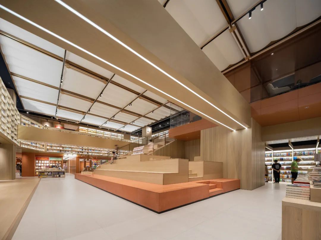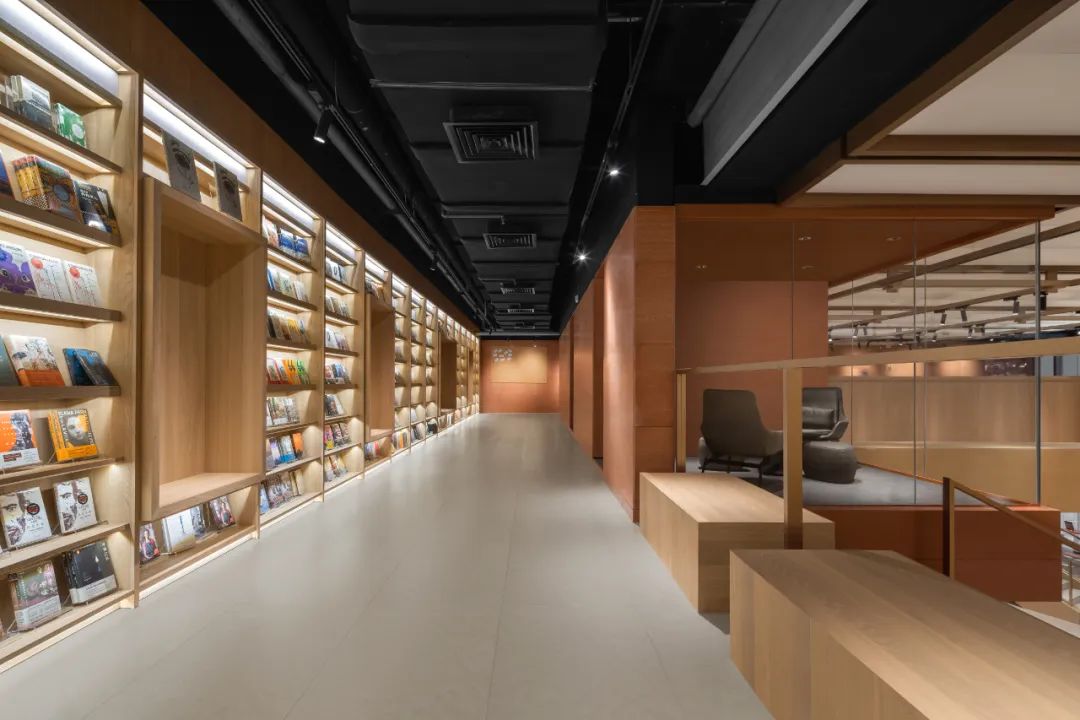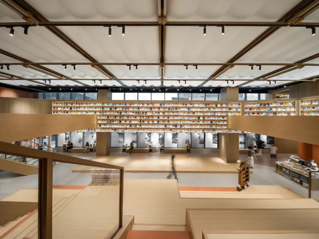 剧场区域通高的空间结构,设计师通过连续的完整的书柜矮墙完成图书氛围的横向延续和衔接,同时视觉纵线上也达成了不间断的效果。前矮后高的书柜格局,也使图书的呈现更具空间感。