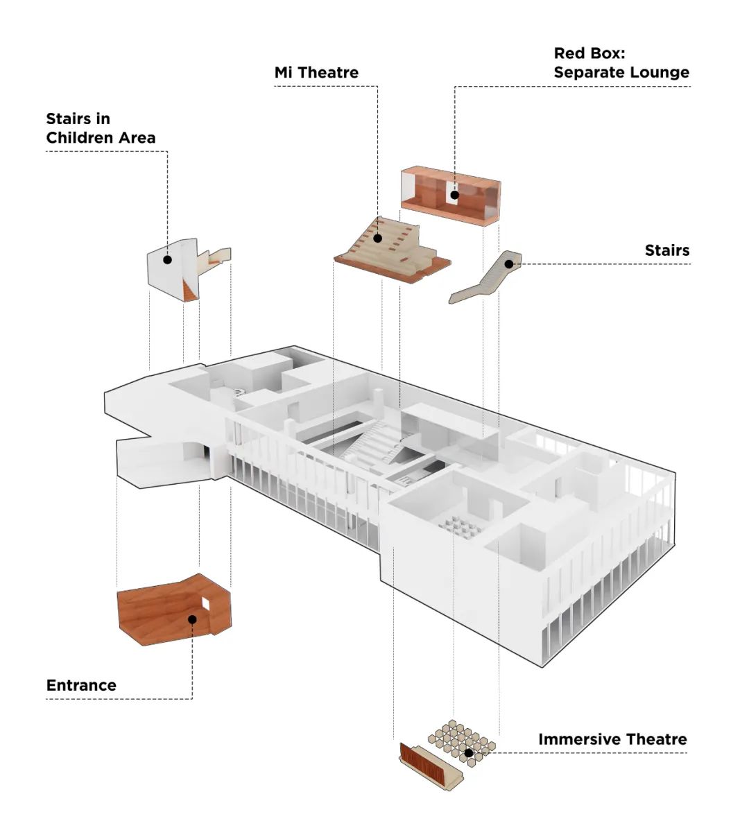 在阶梯上至二层的位置,一个悬挑的“红色盒子”被安置在此处,盒子里布置了几个不同尺度的房间,面向剧场舞台方向,作为剧场功能的补充;落地玻璃的展示面则提示人们在这里“交流讨论”是被鼓励的,另一方面则保证了这里与公共空间的声音不会相互干扰。
