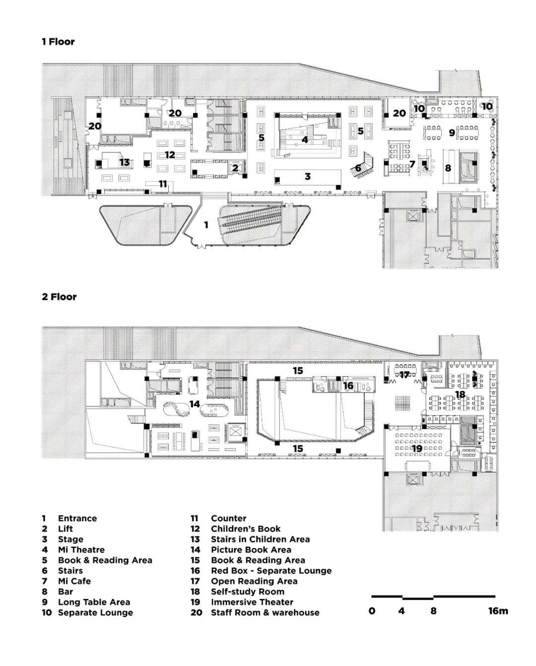 随着时代的发展,知识传播的媒介不仅局限于书本,传统书店“知识交换”诉求变得更加复合,从单一的人与书的关系,到人与人的知识交换,空间的功能也对应的需要更加多元。基于这种思考,设计师将两层的场地中部打通,形成一个开敞通透的的通高中庭,使两层空间更加流畅开阔。大面积阶梯式的座位的置入构建了一个开放的公共活动空间,因此也重构了两层空间的交通动线与形式。