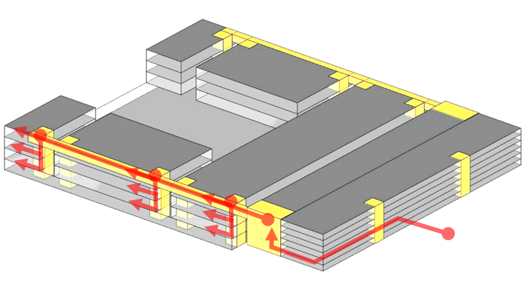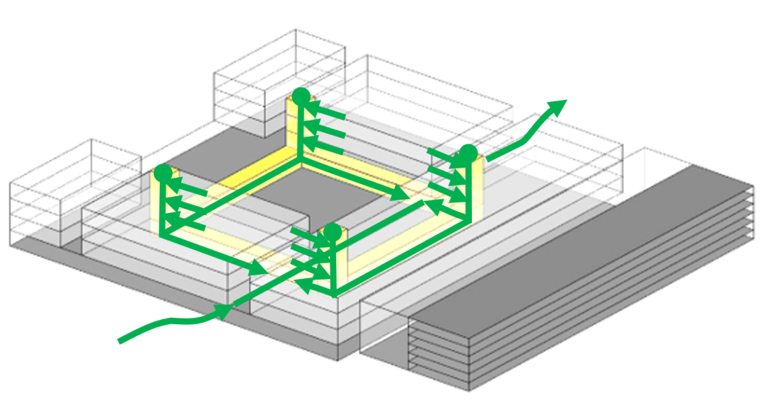 开口的U形。北侧作为主要的人员和办公车辆出入口。再利用南侧原有的仓库和物流广场作为主要货物进入端。位于三层的连廊将仓库和5个车间连接起来,内部布置智能物流系统,将原材料便捷地运送到每个车间。除位于中间的开敞绿地外,其余建筑下方的地下室连接成为一个整体,层高7.2米,净高可以满足冷藏车的通行。成品从车间出来后通过货梯运送至地下室,并由冷藏车直接运走。