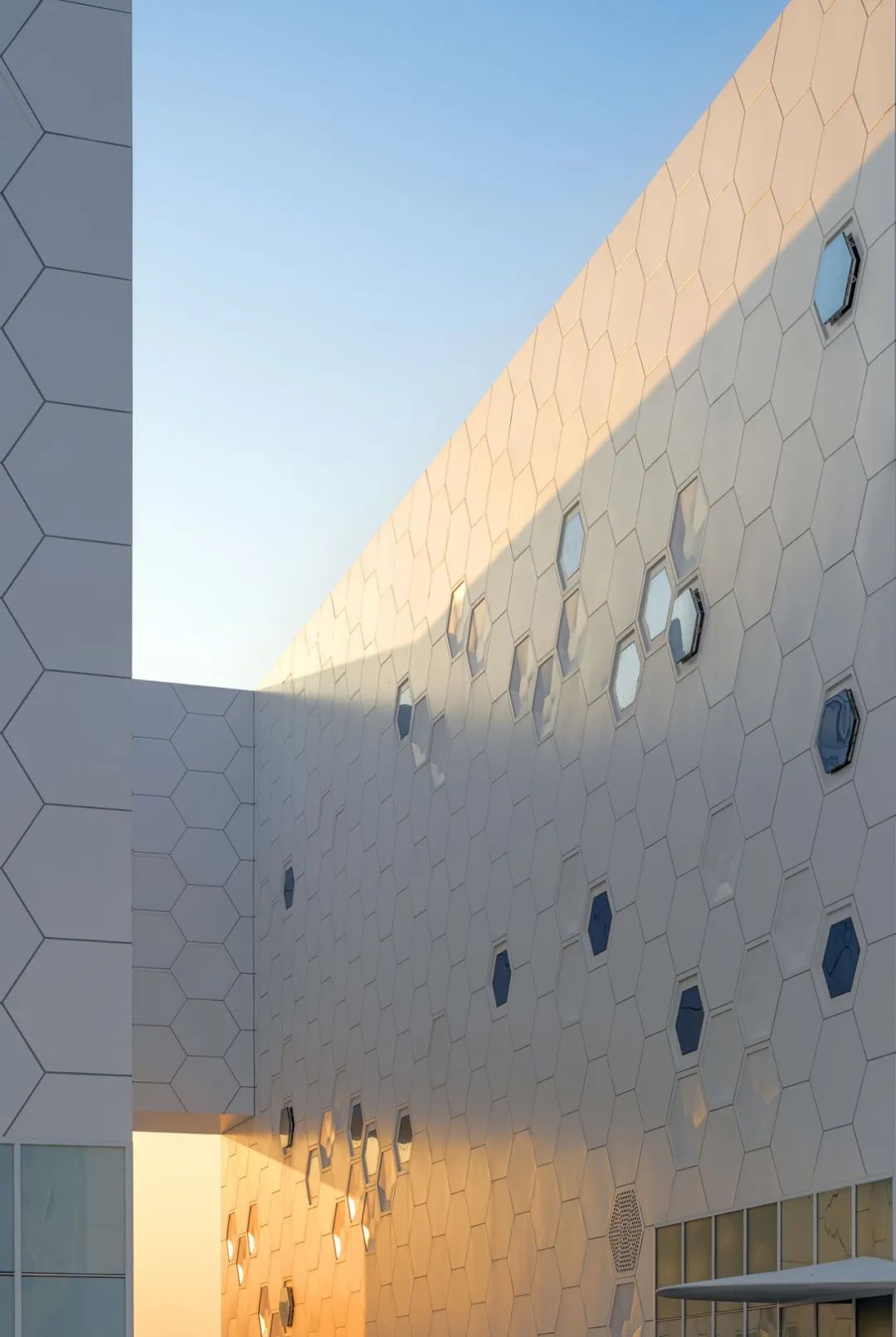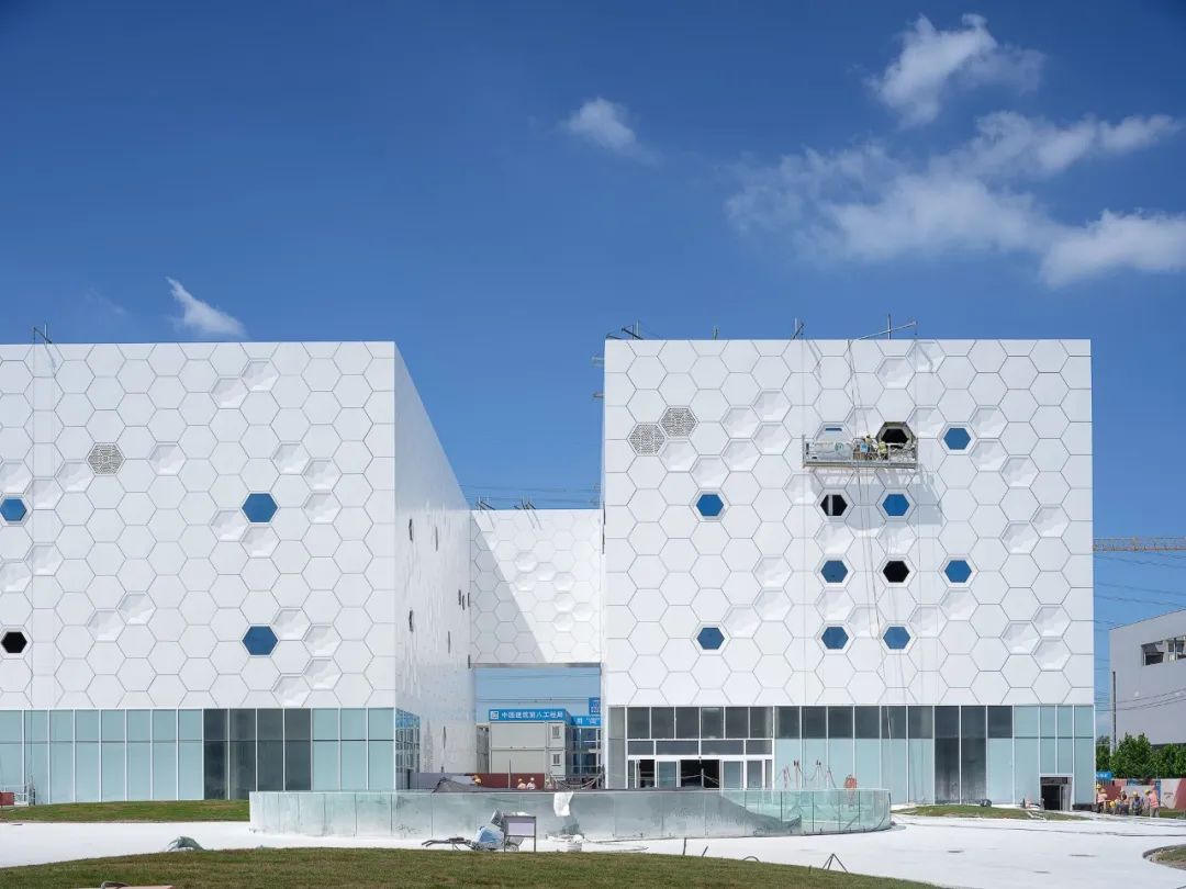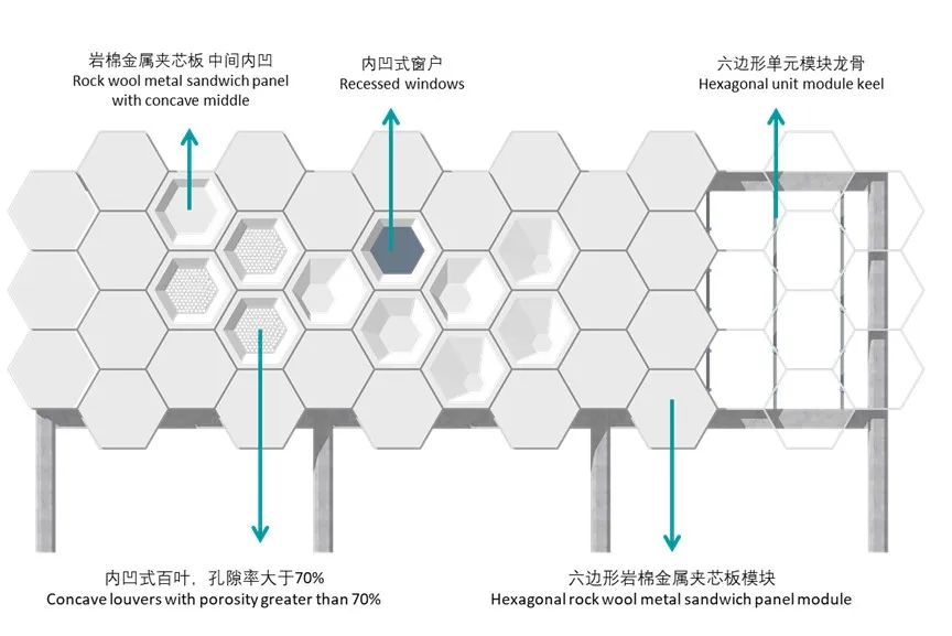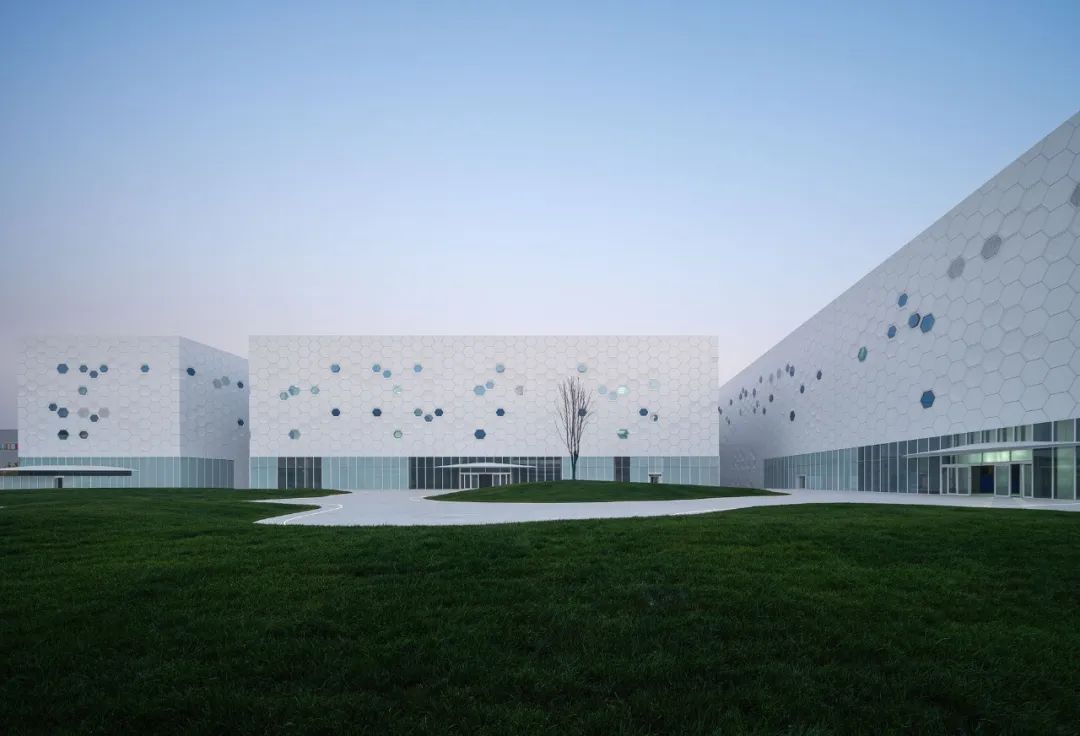 业主和我们都认为生命体中,细胞聚集的形态具有优雅的美感。我们从这一形态中抽象出微妙变化的六边形,使其成为立面的纹理。就像4种核苷酸不同的排列可以构成千姿百态的生命体DNA一样,我们在立面上选用平板、凹版、玻璃和穿孔百叶四种基本单元,基于室内功能需求,运用参数化设计进行排列,形成凯信厂区独特而富有变化的表皮纹理。