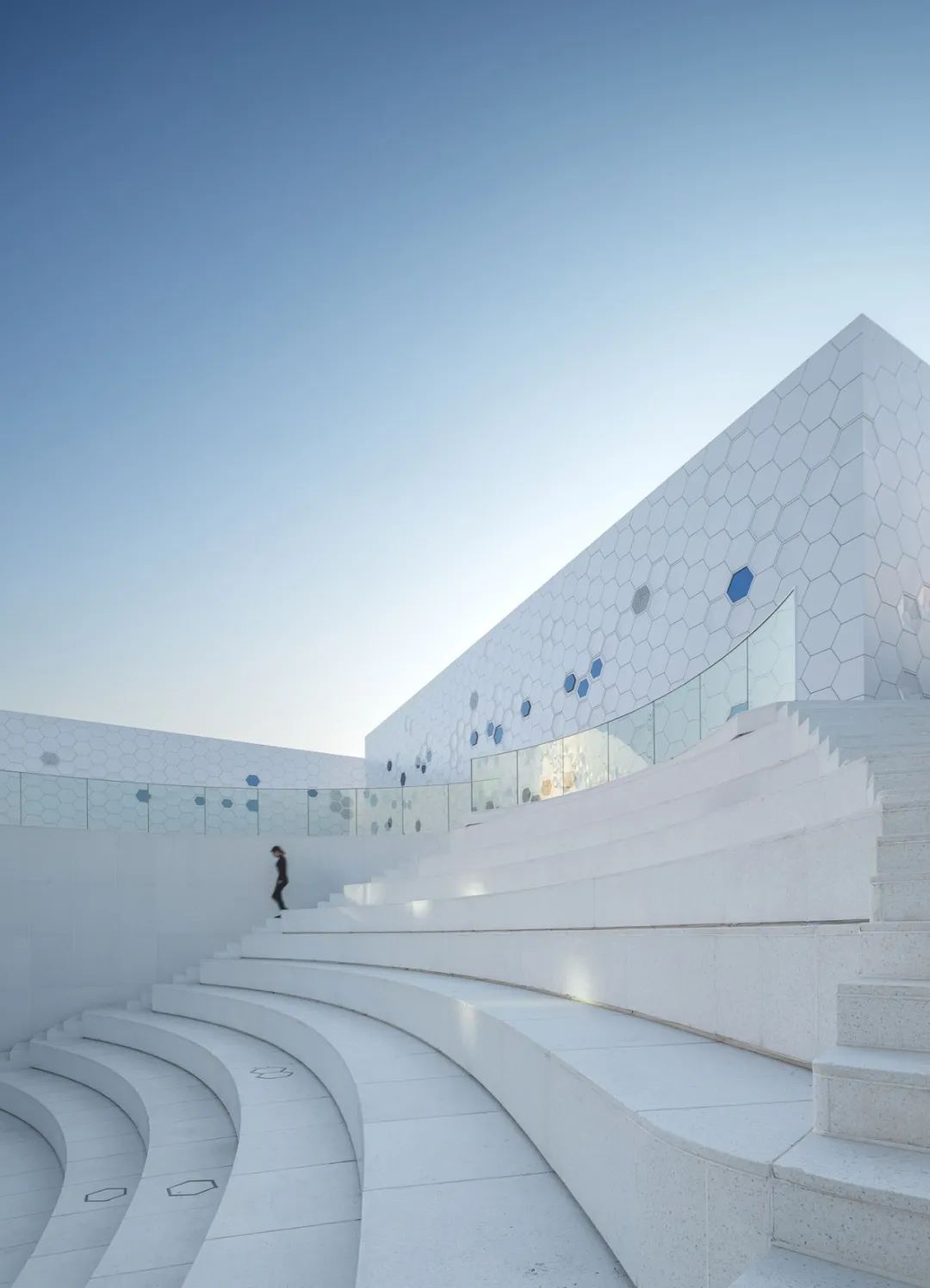 在庭院中,结合人防出口的功能性需求,我们设计了一个下沉的露天剧场,在解决地下疏散和采光通风的同时,也得到了一个具有各种使用可能的场所,古希腊式的理性让它也成为驱车来此的人们对于科兴的第一印象。