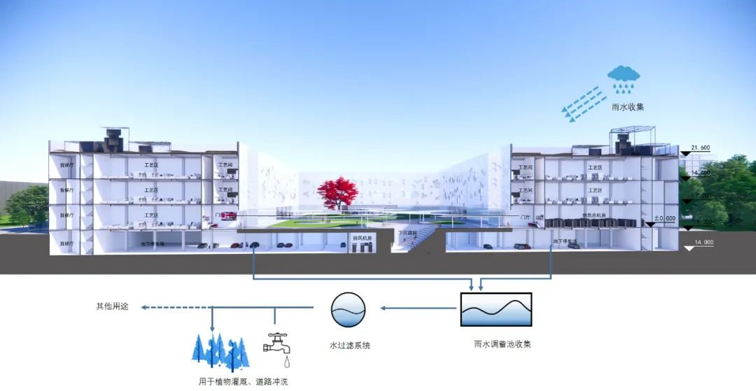 凯信厂区所有的雨水都通过管线收集到南北两个雨水调蓄池中,并安装过滤设备,过滤后的水通过中水管线再回用于景观灌溉和洗车冲厕,节约水资源。