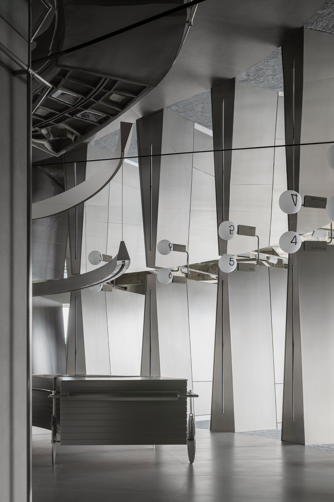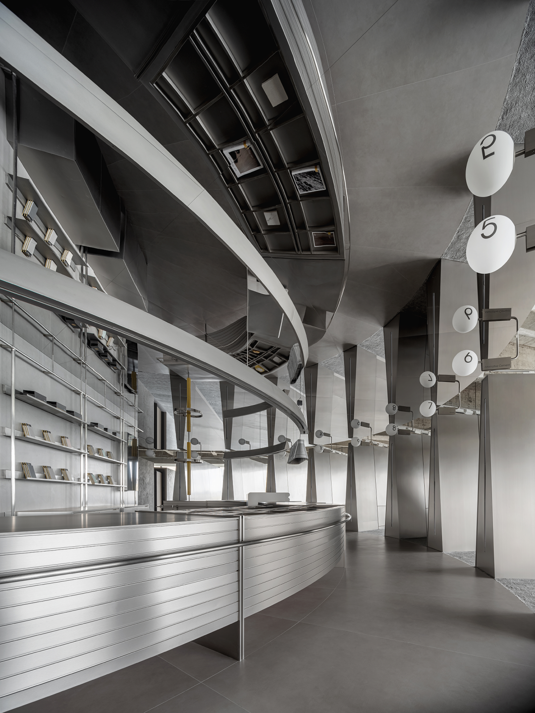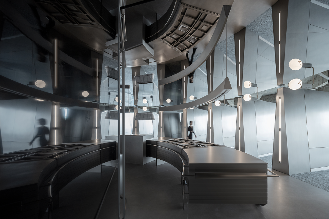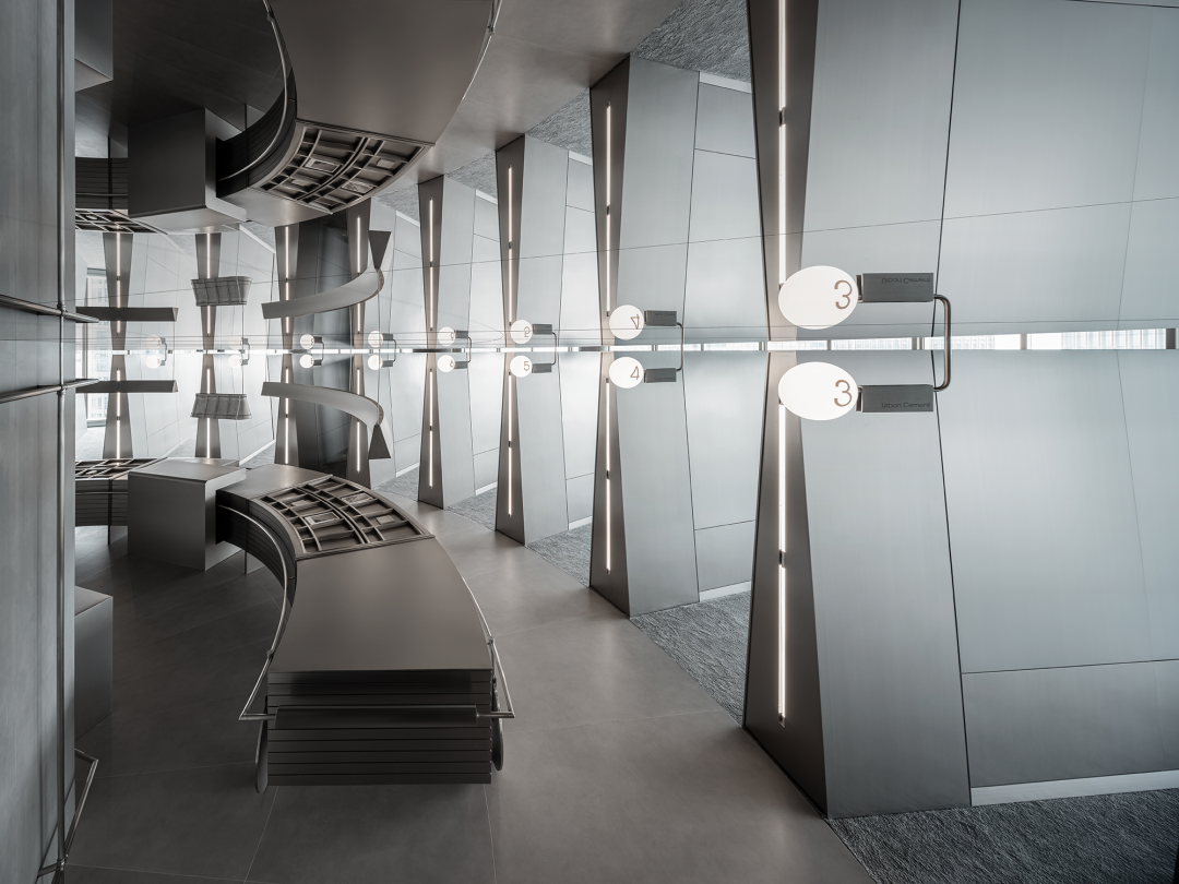 日新月异的商业潮流中,不断探索优化迭代的方式是时代所趋,为传统商业打造高端新零售空间,在价值观高度契合的基础上,设计师探索了商业新零售与科技艺术的边界,将传统陶瓷砖展厅打造为一片全新的游走于商业性、艺术性及新零售体验场所之中。泛家居建材行业通常被归类为低频消费范畴中,在信息互联网飞速发展时代,体验式商业逐渐成为社会主流消费趋势。全新费罗娜总部展厅的设计理念以科技与新零售结合为出发点,用别具一格的风格打造沉浸式新零售体验空间。其设计构想打破了行业束缚,目的是将定义为低频消费的瓷砖产品向高频零售陈列模式去转变,从而更适合在消费日常的高频消费空间中汲取灵感,将费罗娜展厅打造成高端零售展陈空间,让瓷砖这低频消费产品更吸引年轻消费者的目光。拉近产品与消费者的距离,而在行业中起引领作用需要与年轻世代链接,同频于年轻领域日常消费审美。陶瓷展厅从低频消费到高频消费场所转变,高频消费场所的空间生命周期需要拉长,从商业市场中了解消费者衣食住行的消费惯性,将情感连接,以“时尚、科技、自然、个性”为设计核心价值,营造出多感官参与的沉浸式体验空间。利用光线、空间和材料引导来访者情绪节奏,探索具有前瞻性展陈方式,让费罗娜品牌以其先锋性理念,不断引领行业发展。从硂的哑光灰到未来银,和谐又独特,诉说着费罗娜品牌相承历史,精进未来的故事。展厅原空间呈现扇形结构,全展厅平面设计因地制宜,采用放射形状布局。灵动的穿梭动线没有设限,将新零售空间赋予自由形式的转换,打破传统展厅动线设计,“去动线化”设计赋予空间最大自由度。设计师为展厅打造定向出入口,进入后在展厅陈列架之间自由穿梭,与来访者肆意行走的足迹、不自主的自然围合、随处而落。展厅采用拉丝不锈钢作为唯一的装饰材料,直立于空间中将展示产品进行分类,而作为展厅中心的“岛台”成为视觉交汇中心点,展厅外围落地玻璃窗,将自然光线融入室内,丰富的光线与产品相互交融,还原产品自然的本质。生活逐渐脱离复杂化,而追求一种以最短距离将材料、功能、形态结合起来的合理性,及单纯性、个性表达之余,空间内被置入尝试与体验式的设定之中。空间的有机与自然的变化,在游走中感知材质的交融。平面排列放射线设计,14个门道围列成扇形平面的展厅,定制球型灯饰环绕半空,再现宇宙星际的品牌之源。室外光线从门道照射进展厅,立体而灵动,贯彻空间的通透感,赋予展厅更无拘的自述力同时雕刻了空间的模样。利用光线、空间和材料引导来访者的情绪节奏,体现大空间容纳多样展陈的优势,创造不一样的展示空间。全展厅拉丝不锈钢金属的运用,超高的品质感营造出炫酷的未来科技氛围,各种距离的弧线在平面或立面关系中交错呈现,融入在整体的空间氛围之中,又找到充满平衡感的韵律。设计突破常规实用的领域,向艺术领域探索。14个门道也是14面展墙,每个展墙上展示不同规格产品,通过金属插件调节,更加灵活地展示产品的多样性。展墙上方是多媒体数字屏,放着带节奏音乐,屏幕上形态各异的产品纹理交相辉映犹如银河,球型灯饰如同无数颗星球悬浮其中。令人不禁遐想到科幻电影中飞船在不同空间里航行,声光电的融合使整个空间充满未来感。展架跳脱出传统的木料和绒布组合,采用不锈钢材质,并在用户产品挑选区域铺上地毯,为来访者提供在随性游走之间,感受自然、舒适、充满人性化的选物体验。在冷暖碰撞、新旧更替之间,通过不同材质的创造性发挥,给人以独特的感官体验。